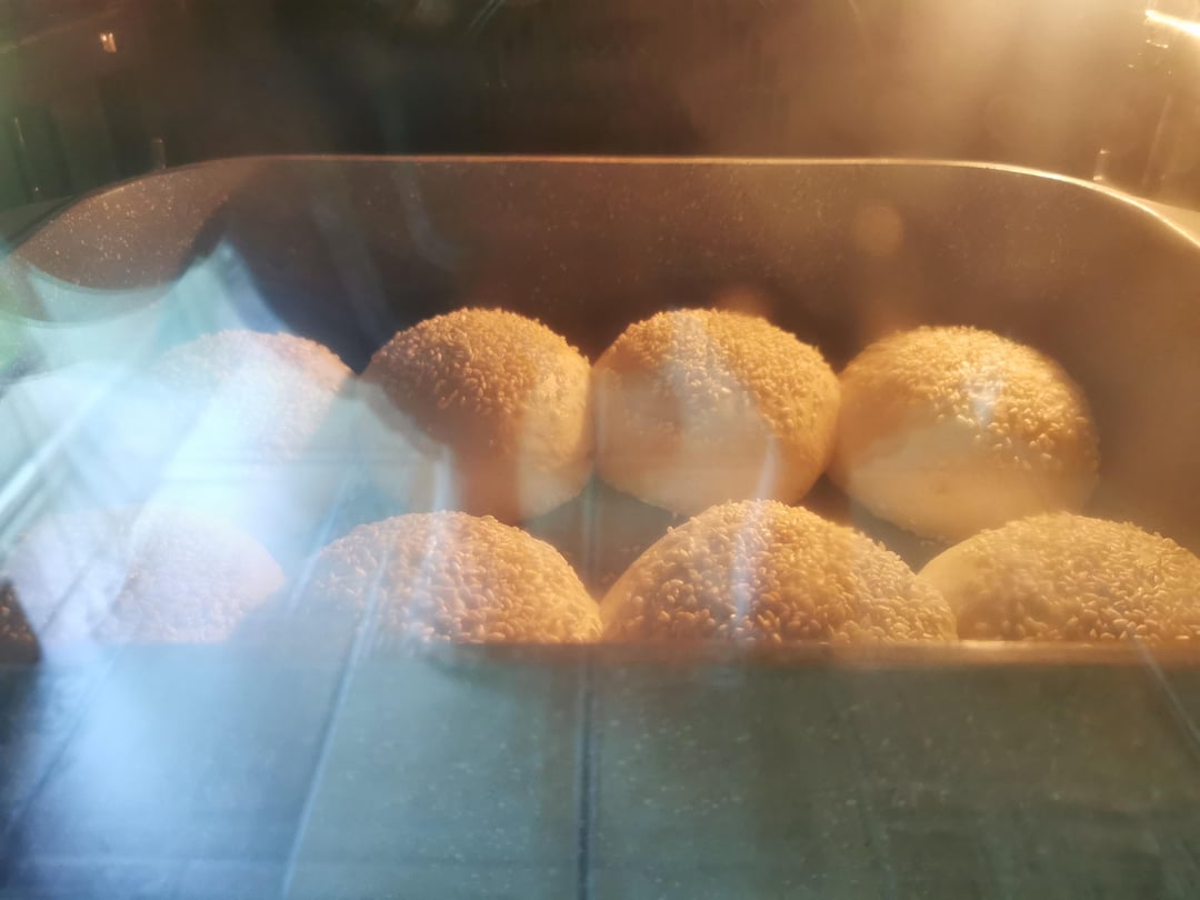 You let them rest for 15 minutes while the oven warms up. When the 15 minutes is done, you put the egg white on the with a brush and pour some sesame seeds on top. Put water in the bottom of the oven in a separat pan and after heating it up to 200 °C, you can start baking them. You can start heating up the oven while the buns are waiting to be baked. For me it usually takes ~20 minutes to bake the buns nicely, but you kind of want to always pay attention to them. Sometimes I lower the temperature to make sure it bakes thoroughly. And that’s it, enjoy your buns!