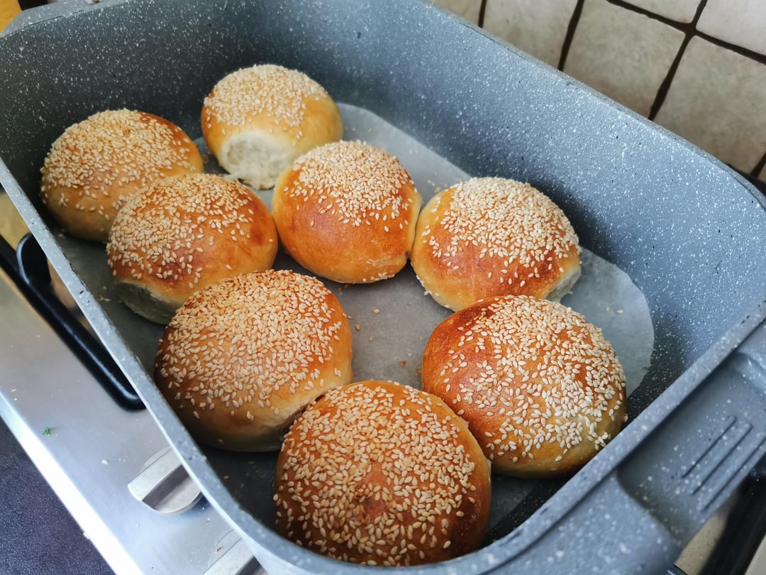 40 °C water, add the sugar, add the yeast, mix to be smooth, 10 minutes on 25°C to turn the yeast on. The flour gets the salt mixed in it. Then after the 10 minutes, you mix the milk with the water that has the yeast in it and then slowly add and mix the flour with the liquid. I have that mixing machine so I use that one on the second speed for 10 minutes to mix the dough well. You can do the whole mixing process with the machine tbf. After that, you knead it a bit and put it in a large bowl that you seal airtight and let it rest for 1,5 hours. Then you knead it again and let it rest for another 1,5 hours. The gently knead it, you measure it and decide how many rolls you wanna make. This dough ended up being 875 grs in the end so I made 8 out of them ~110 gr each. You let them rest for 15 minutes while the oven warms up. When the 15 minutes is done, you put the egg white on the with a brush and pour some sesame seeds on top. Put water in the bottom of the oven in a separat pan and after heating it up to 200 °C, you can start baking them. You can start heating up the oven while the buns are waiting to be baked. For me it usually takes ~20 minutes to bake the buns nicely, but you kind of want to always pay attention to them. Sometimes I lower the temperature to make sure it bakes thoroughly. And that’s it, enjoy your buns!
