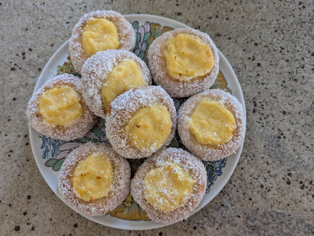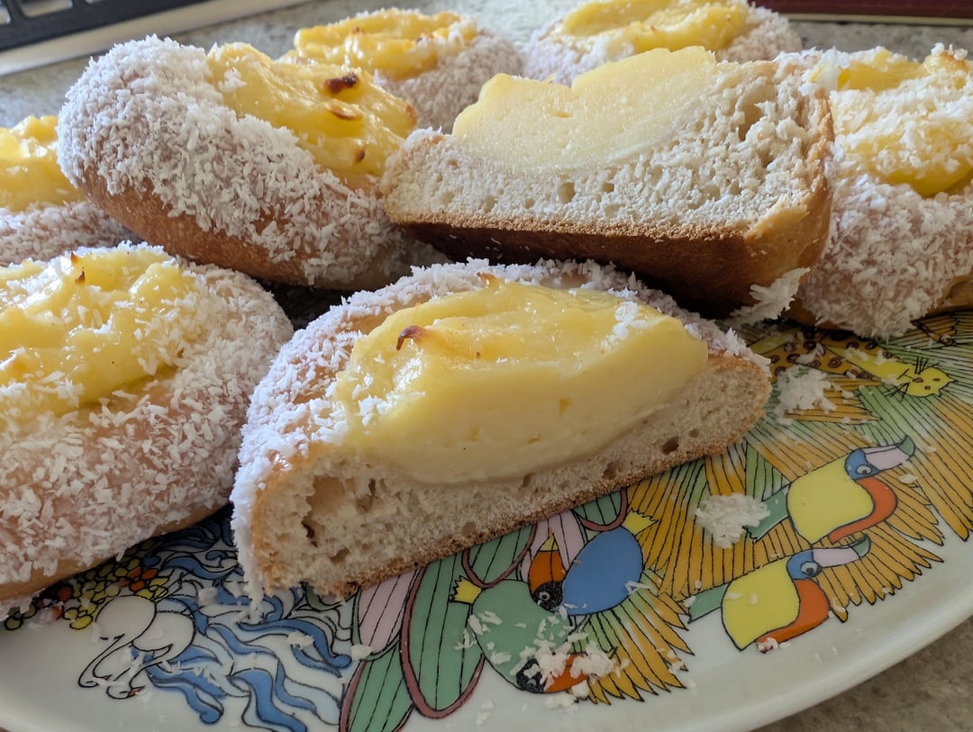 1. **For the custard.** In a pot, whisk together the eggs, sugar, corn starch and vanilla paste. Whisk in the milk and place on medium heat 2. Cook until thickened, then transfer to a bowl to cool, covering with clingfilm touching the pastry cream. 3. **For the bread.** Combine the milk, yeast, salt, sugar, cardamom, and butter. Mix well to dissolve the sugar and hydrate the yeast. Add the flour and mix to a dough. 4. Knead the dough for 6 minutes. 5. Cover and proof 30 minutes. 6. Fold the dough and then proof overnight in the fridge (or 60 to 90 minutes at room temperature). 7. Divide the dough into 8 equal pieces (about 80 g) and shape into balls. 8. Rest for 15 minutes. 9. Stretch the dough balls to form a depression in the middle. 10. Cover and proof for 1 – 1.5 hours. 11. Stretch the dough balls to the desired size. Place them on a non-stick paper lined tray. Brush with the egg yolk & milk mix. 12. Add the custard and optionally smooth it out with a damp spoon/spatula. 13. Bake the buns for 20 – 25 minutes in a preheated 160°C convection oven. 14. Let them cool down completely. 15. **For the topping.** Prepare the icing by mixing the icing sugar with the lemon juice. 16. Brush with the icing and dip the in the coconut.