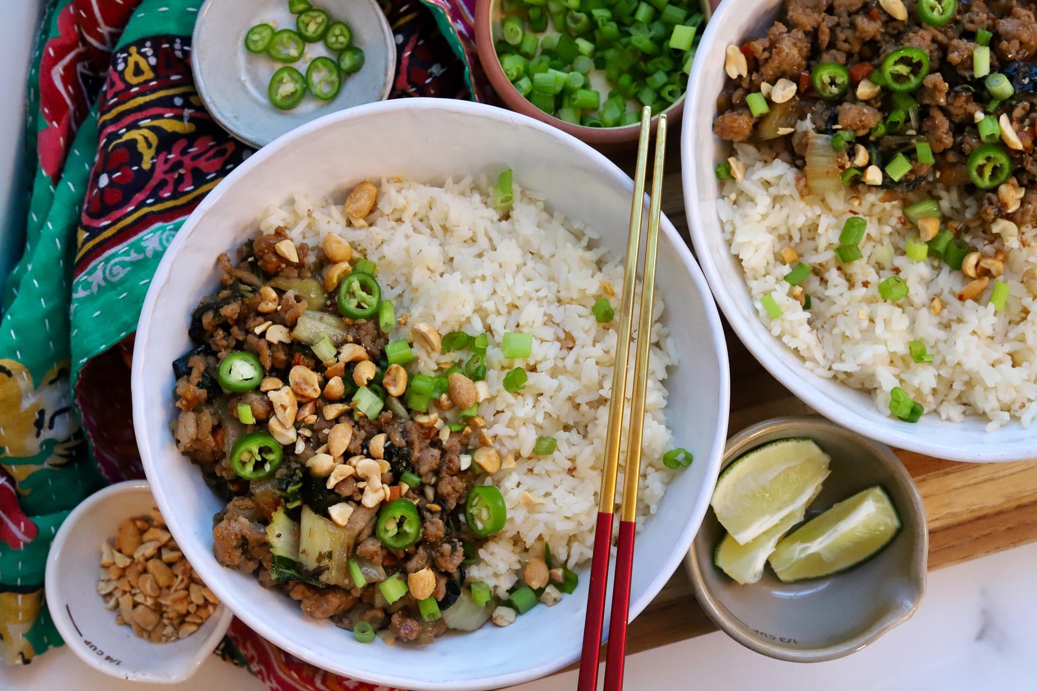 Peanut Sesame Ground Chicken with Bok Choy and Carrots. Serve over rice, cauliflower rice or inside lettuce wraps for low carb, or on its own with a spoon.