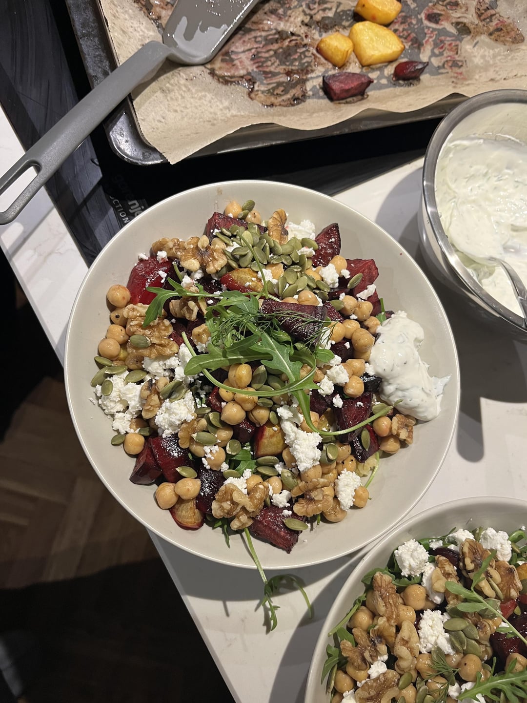 - Some kind of bowl, beets, arugula, walnuts, chickpeas, pumpkin seeds, quinoa