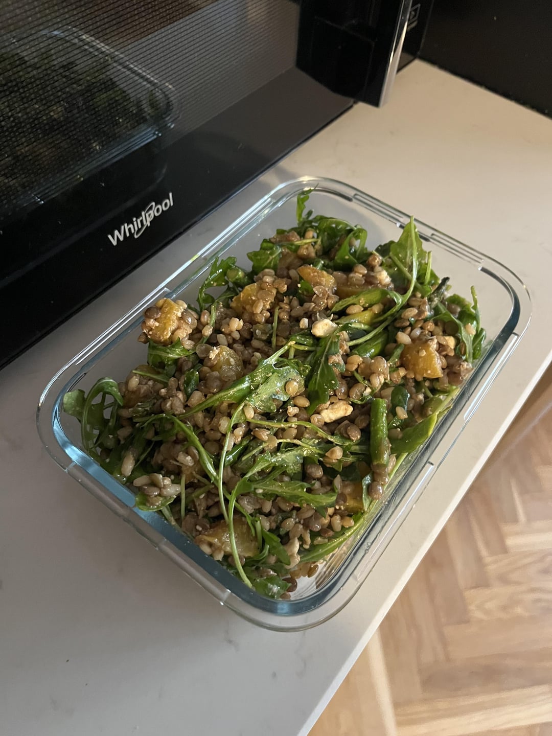 - Typical lunch: farro, lentils, golden beets, asparagus, arugula, feta, Basalmic vinaigrette