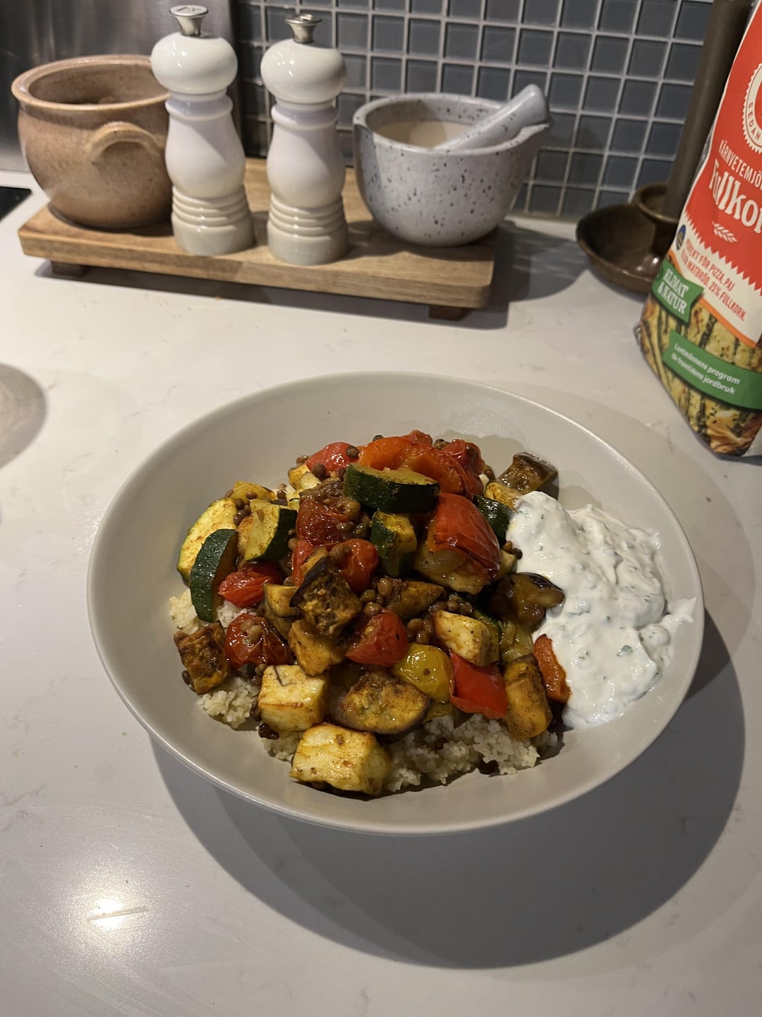 - Shawarma spiced veggies, halloumi, bulgur, and yogurt