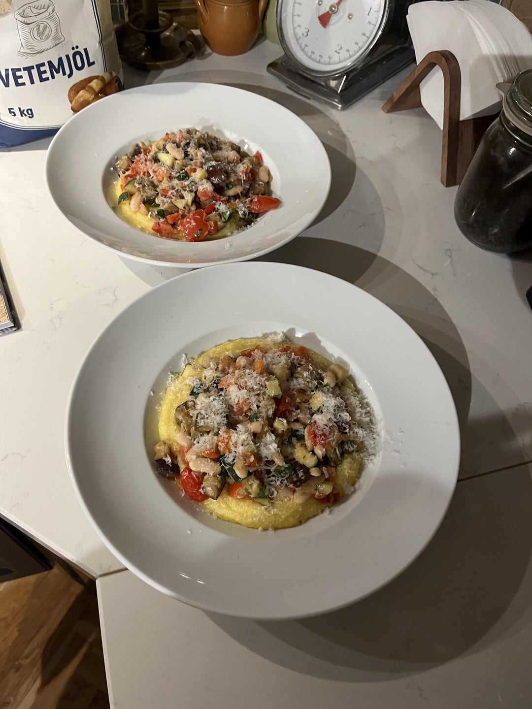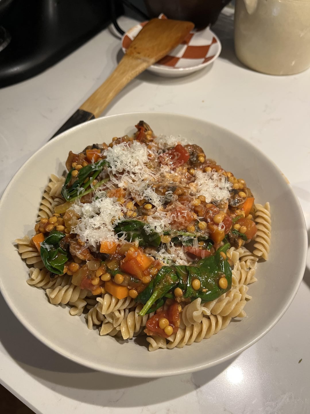 - Whole wheat pasta with a tomato/lentil/musbroom/spinach sauce