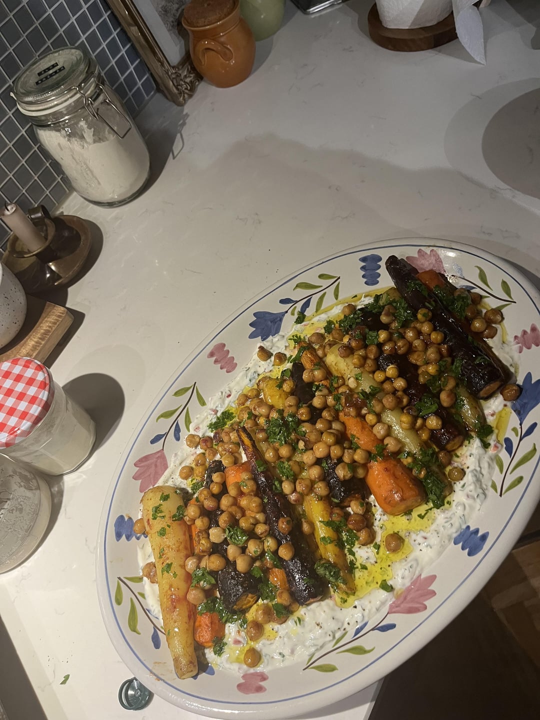 - Roasted carrots with chickpeas and gremolata on green chilli yogurt (also with sweet potatoes)