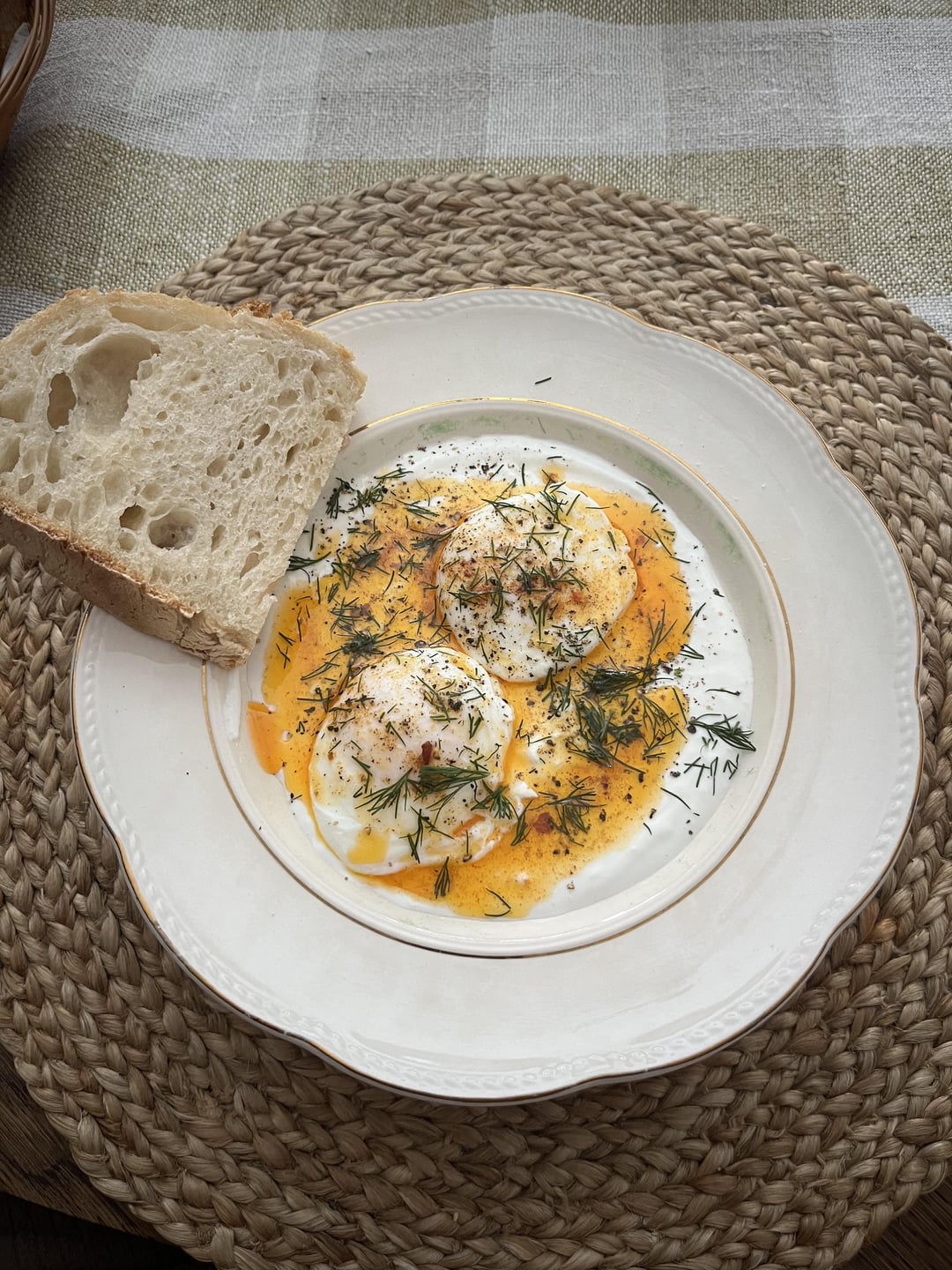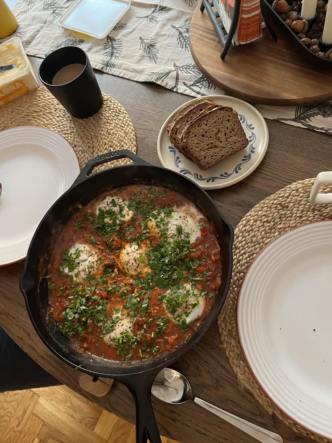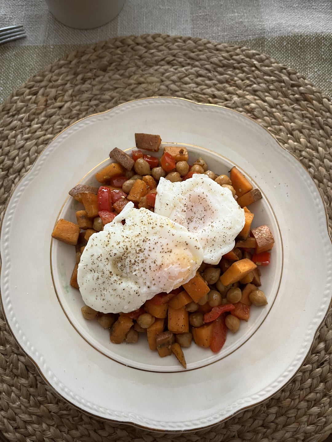 - Sweet potato, pepper, chickpea breakfast hash with za’atar and poached eggs