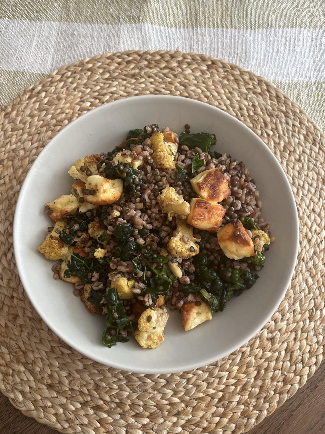 - Some kind of bowl, farro with lentils, black kale, roasted cauliflower, and halloumi