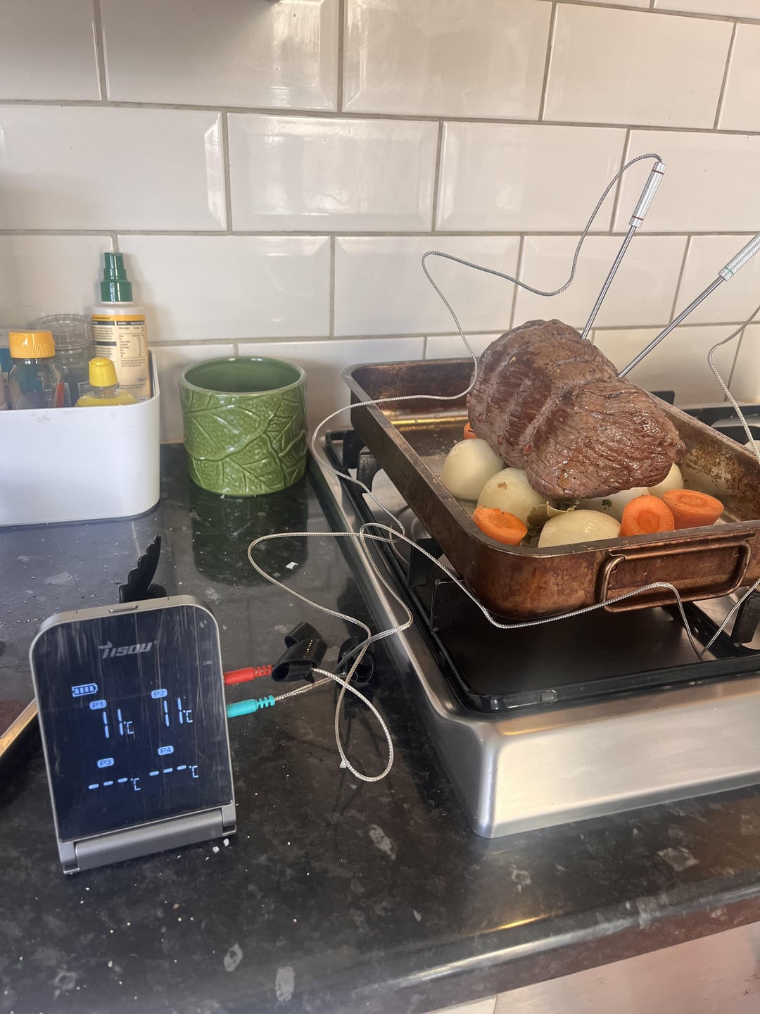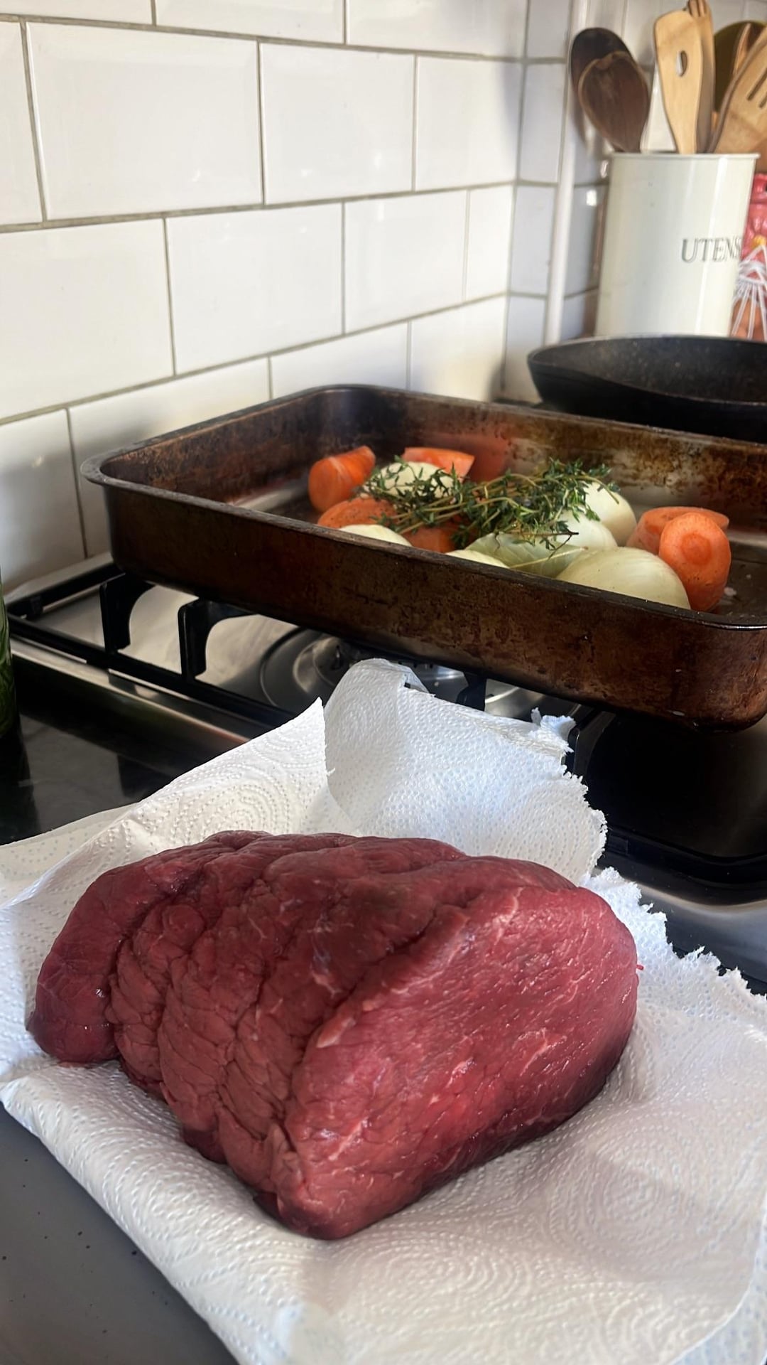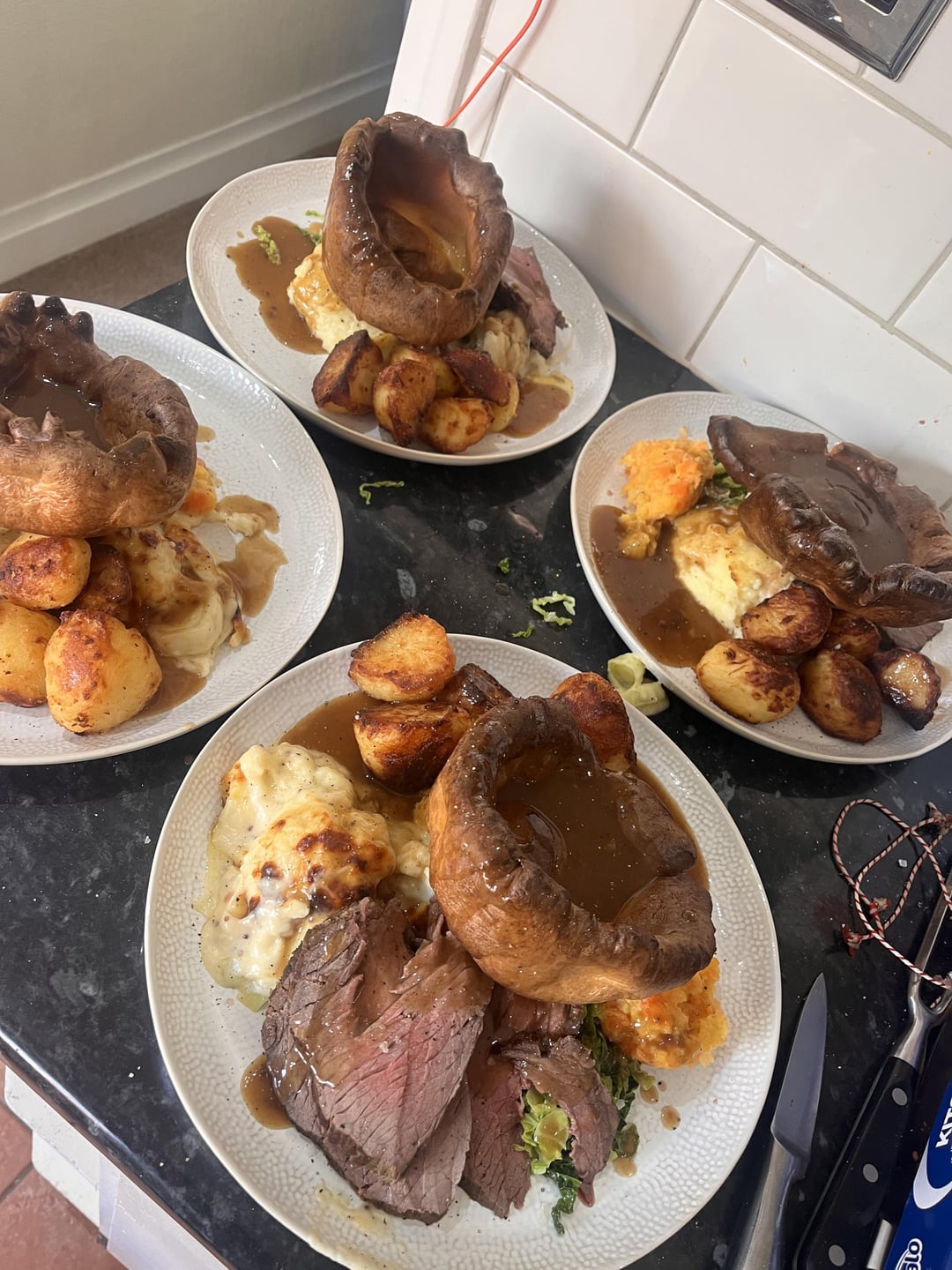 Roast topside of beef, balsamic gravy, horseradish mash, roasties, honey glazed carrots and parsnips (forgotten in the oven at this point), carrot and swede mash, buttery savoy cabbage, cauliflower cheese with leeks.