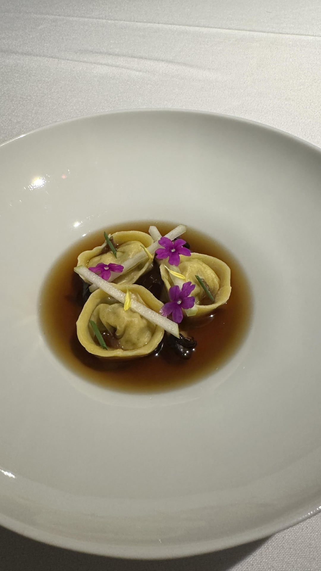 Duck consommé, duck leg & foie gras tortellini with lemon marigold