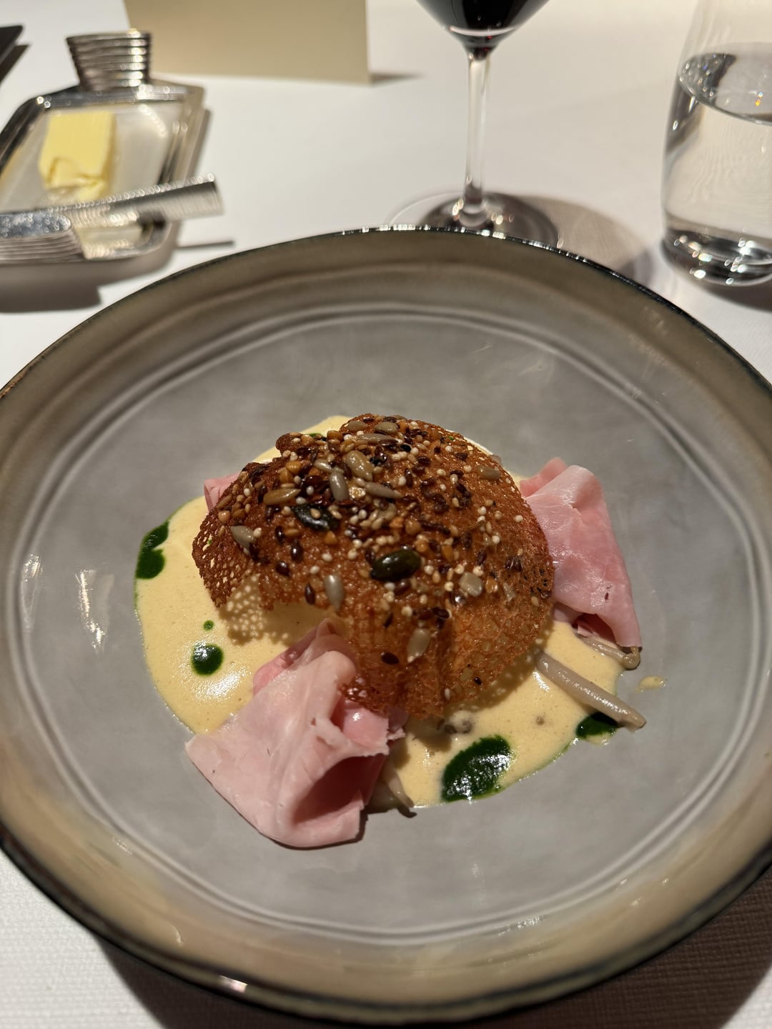 Dish 3: Hops sprouts from Poperinge – farms egg sabayon with white beer – crisp with cereals – and white ham Duke of Berkshire