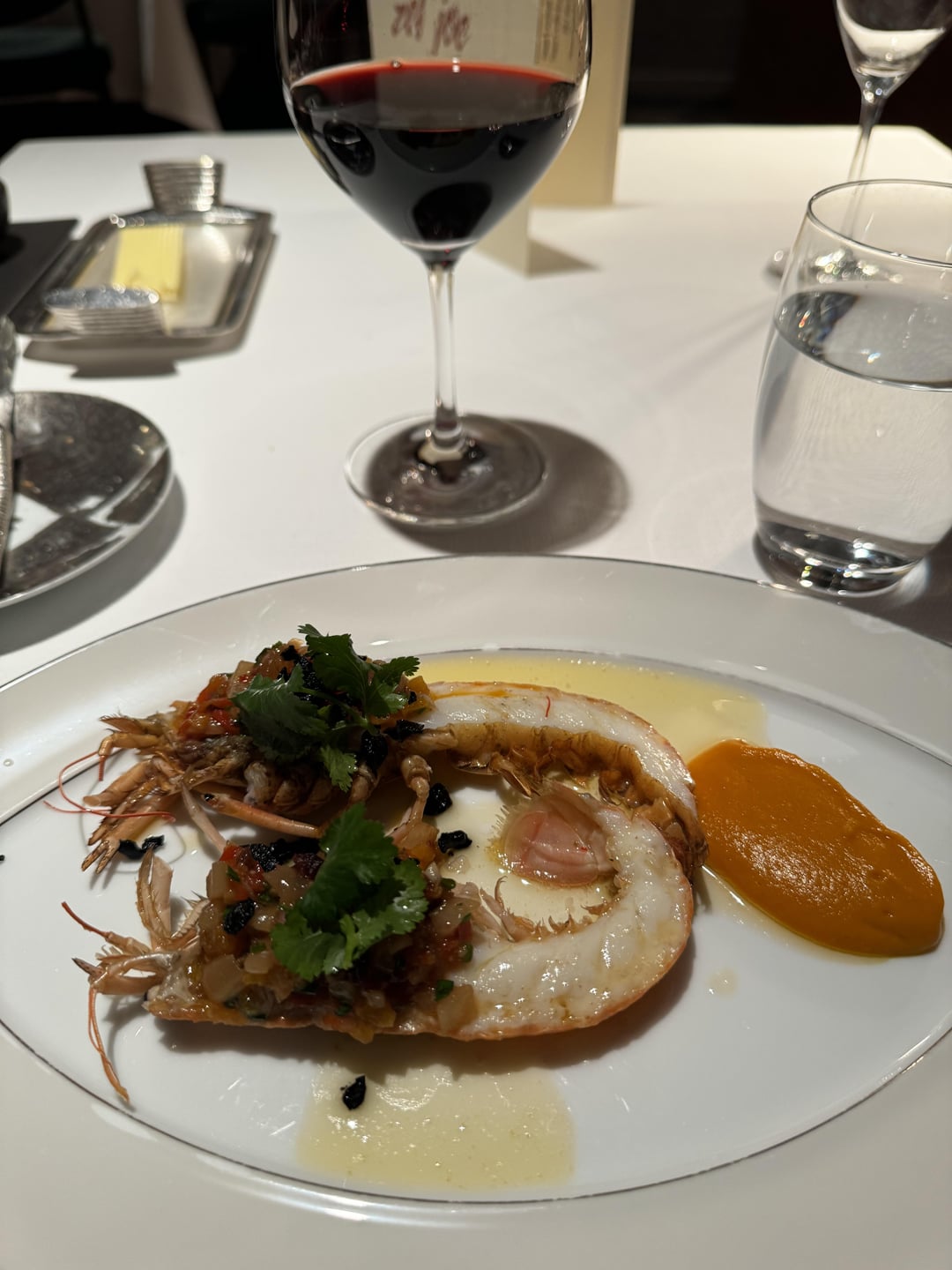 Dish 2: Langoustine Royale baked “carapace” spices – oil of crustaceans, mousseline of carrots, curry and coconuts