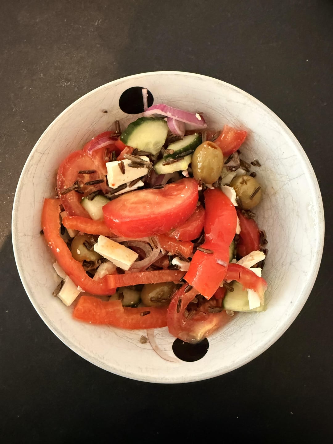 Lunch: Greek salad (tomatoes, cucumber, red onion and peppers) with olives, wild rice, feta and olive oil