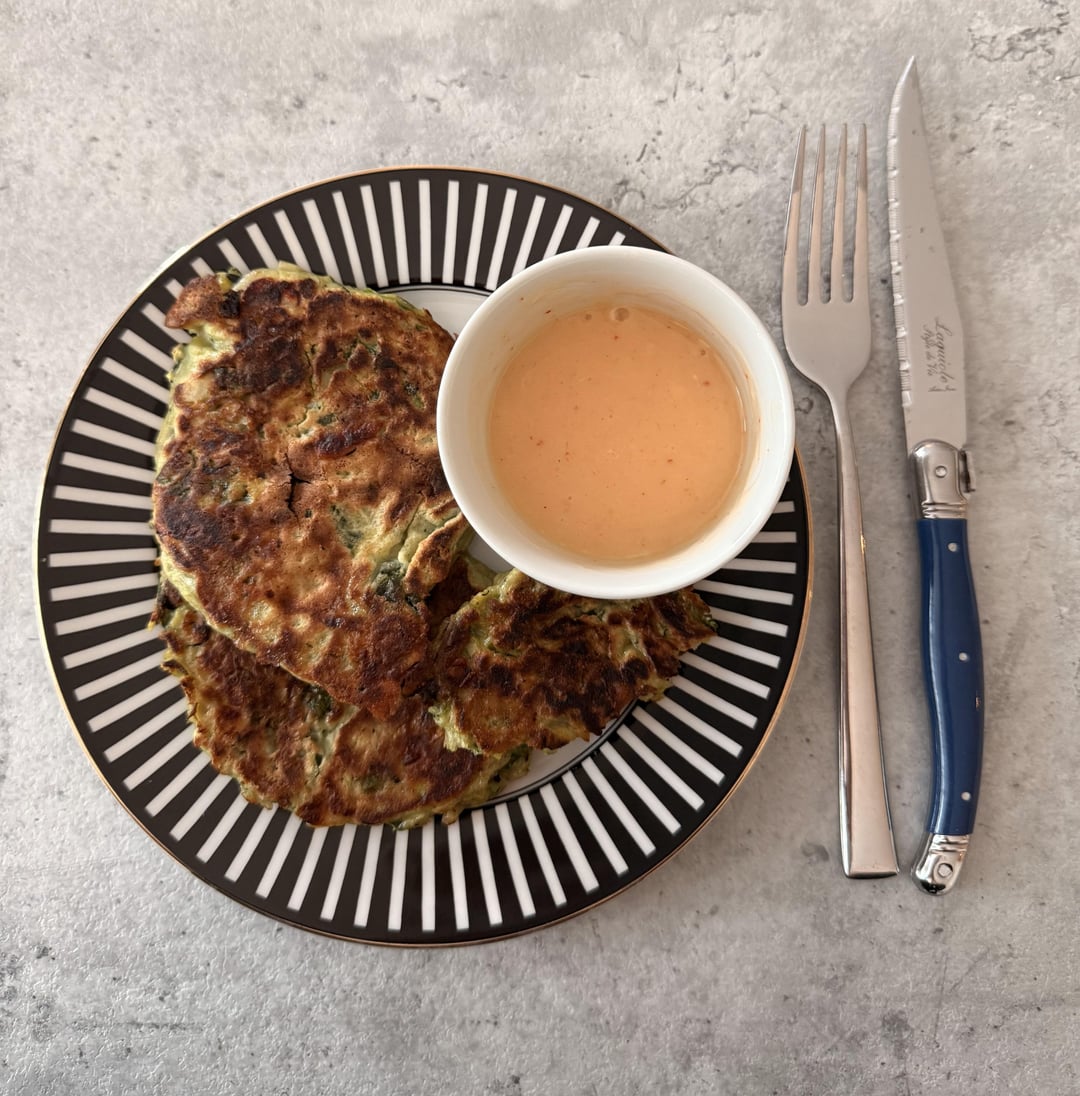 Breakfast: Zucchini-spinach fritters with halloumi baked in olive oil (meal prep friendly!) and mayonaise/chili dip