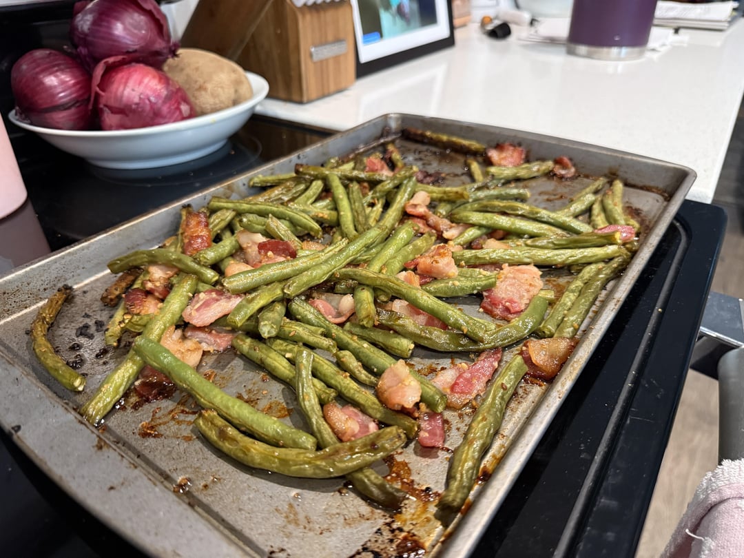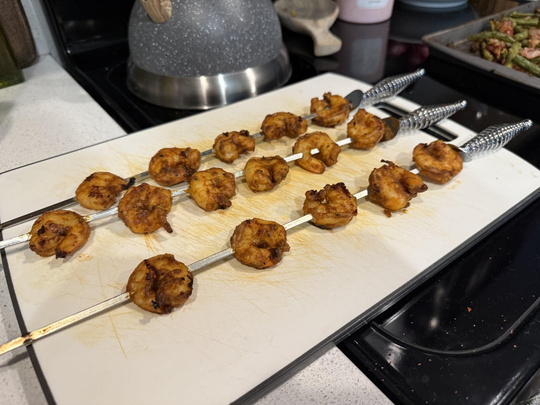 Reverse sear tri-tip, shrimp skewers, and roasted green beans with bacon