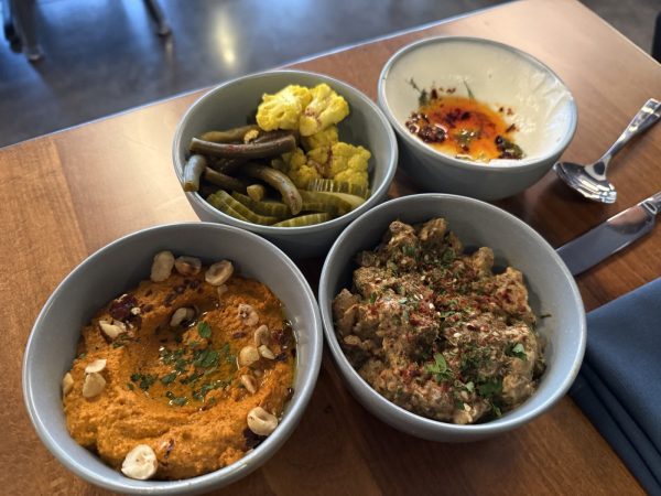 House made pickles, Baba ganoush, labneh, and Muhammara
