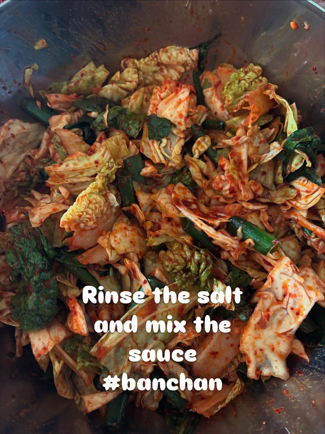 What I will say is that unless you’re planning on eating everything in one sitting, definitely leave out the lettuce. While it may give the Napa Cabbage-like appearance, it will wilt and turn slimy in a couple of hours. You’d be better off using just green cabbage OR doing a salad with the lettuce using soy sauce, sugar, sesame oil, gochugaru, and vinegar.