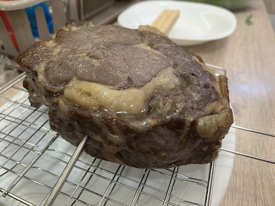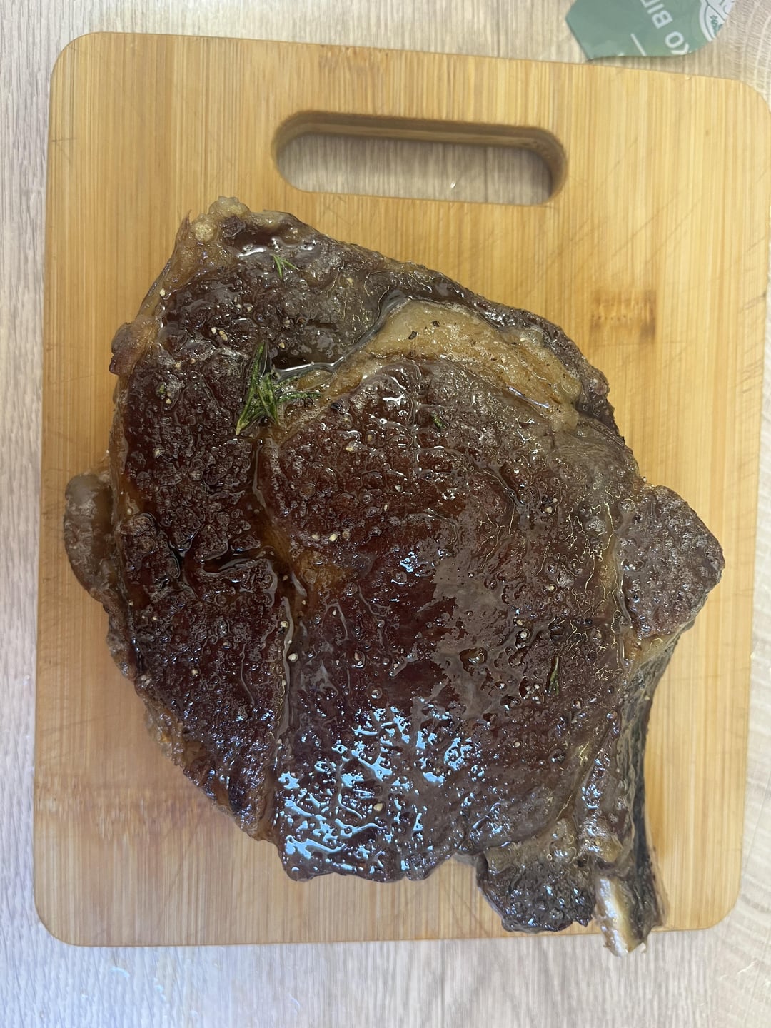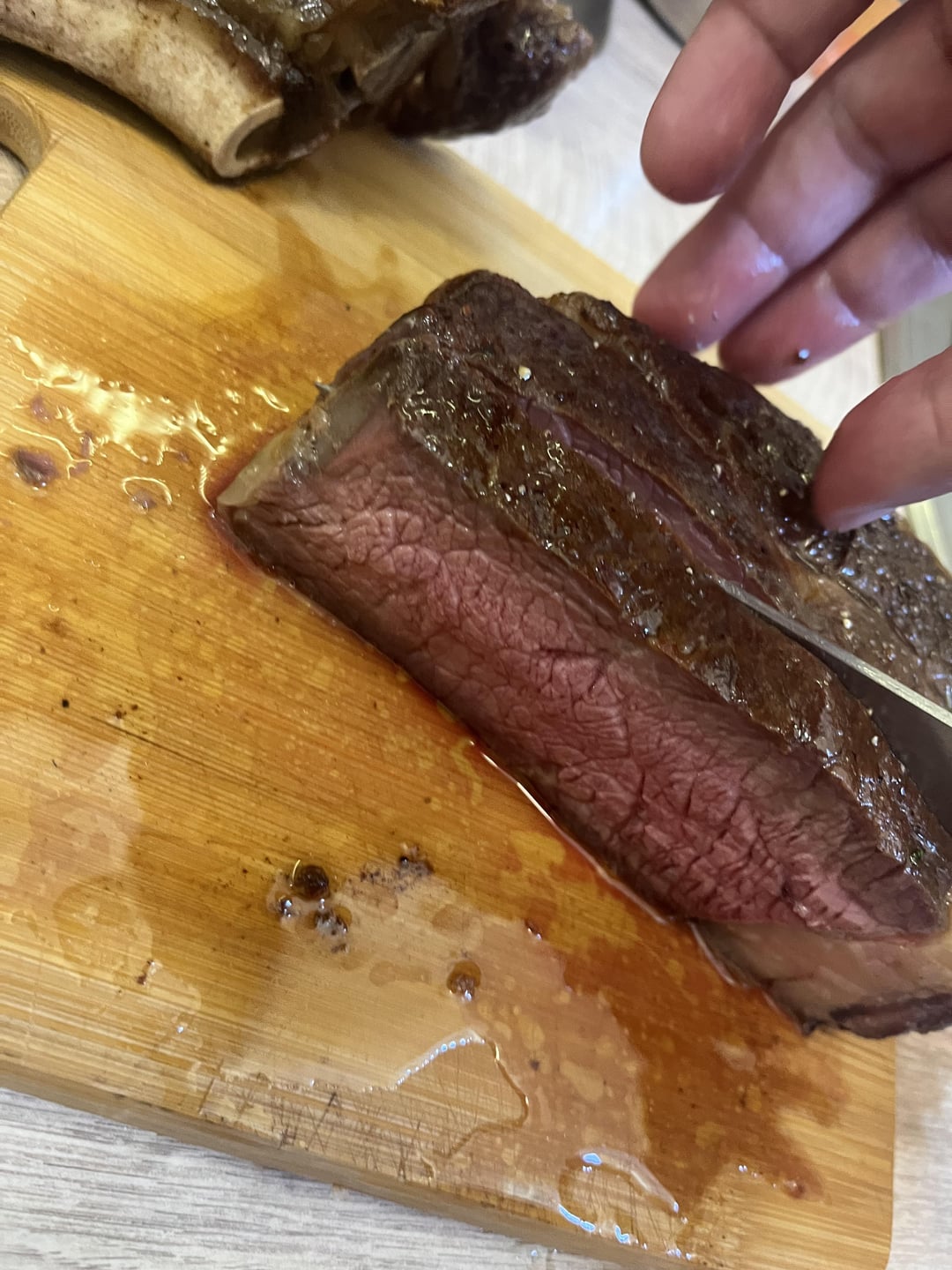 Dry brined around 20 hrs, heated in the oven to internal temp of 54 deg C, the seared on cast iron with avocado oil… maybe could have been cooked less, but taste was really good, I can only compare it with restaurant steaks and it’s not behind, although good advices are more than welcome.