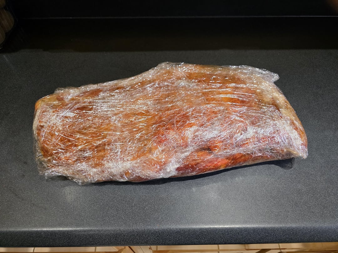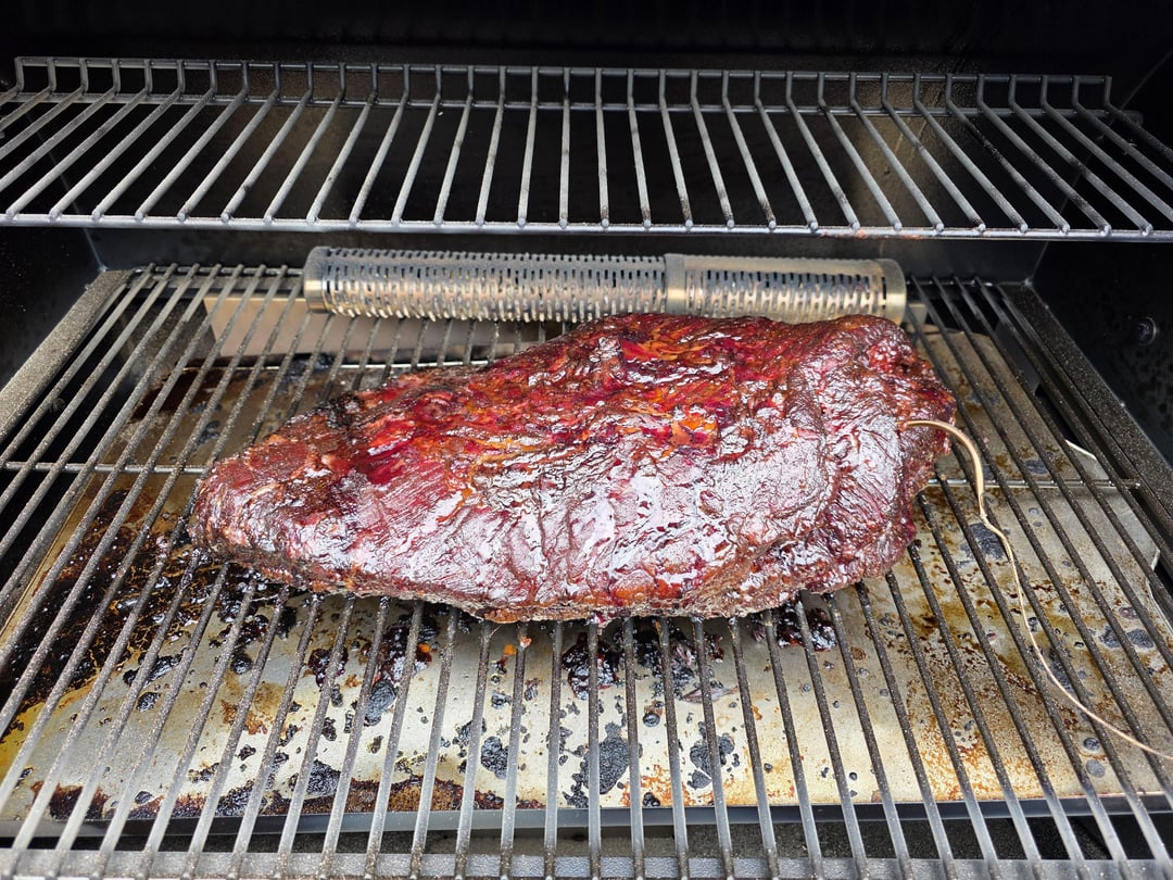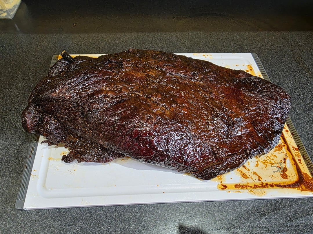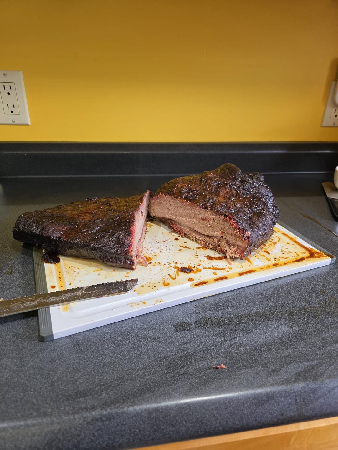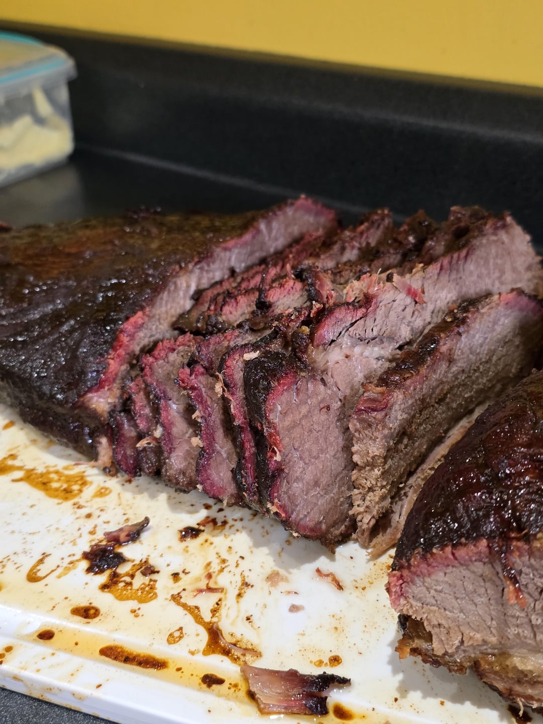 So the rub used was Cabellas maple bacon bourbon. I did a mustard binder, rub then wrapped and place in the fridge for 24hrs. The brisket was left out to warm up before the smoke. Started at 9pm overnight at 185⁰. In the morning I bumped up to 225⁰ to help with the bark. Once the internal temp hit the 165⁰ mark it was wrapped and temp up to 250⁰, trying to hit 203⁰ internal. Once the 203⁰ was hit it was removed, wrapped and place in a cooler to rest. Sat there for 2hrs.