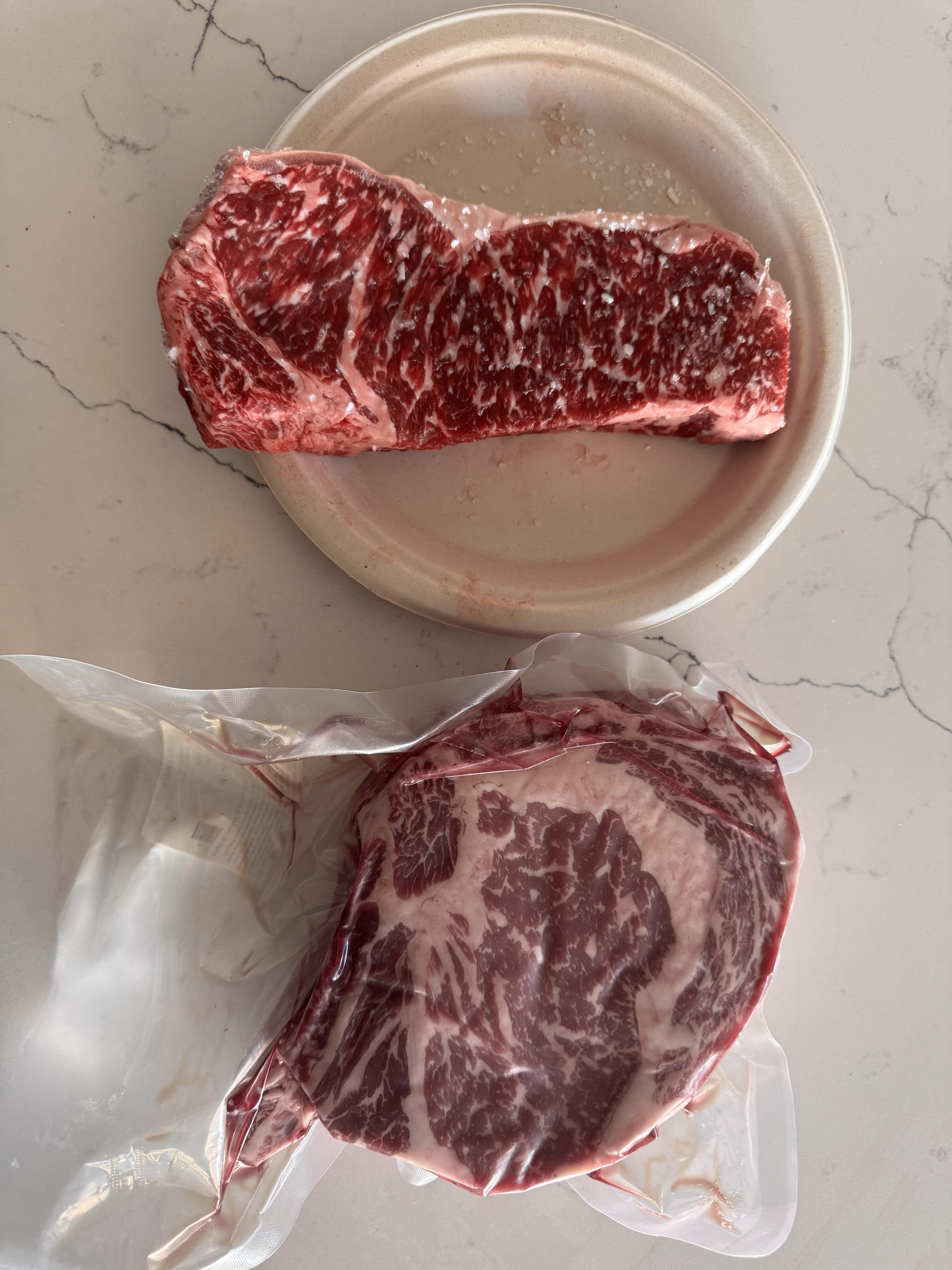i really don't want to eat it saturday since it's for me and a friend, no way i am eating a 2+ lb ribeye myself. was planning on sous vide 132F for 3 hours then a nice sear over lump charcoal on the webster. the strip is getting grilled on indirect heat.