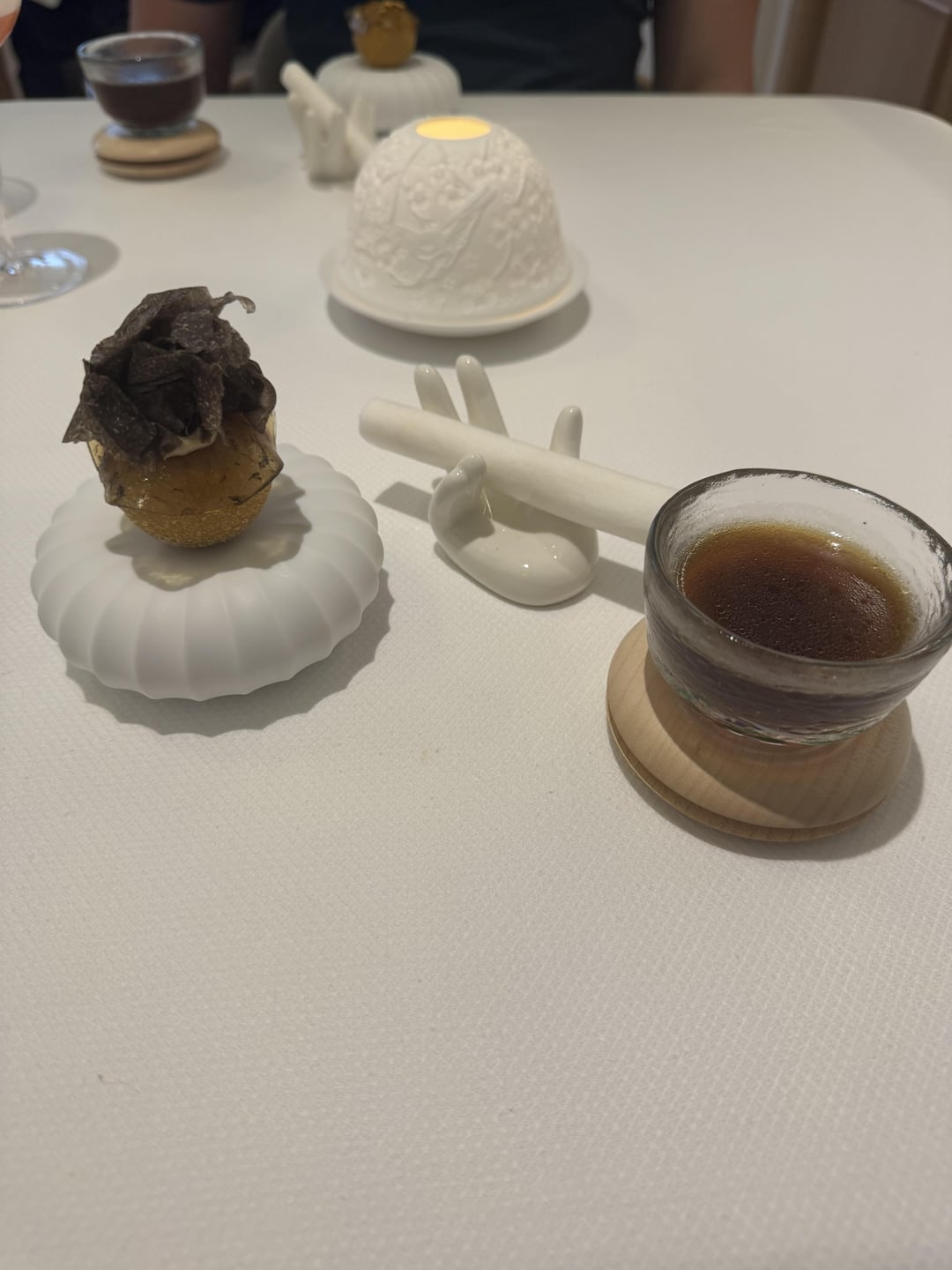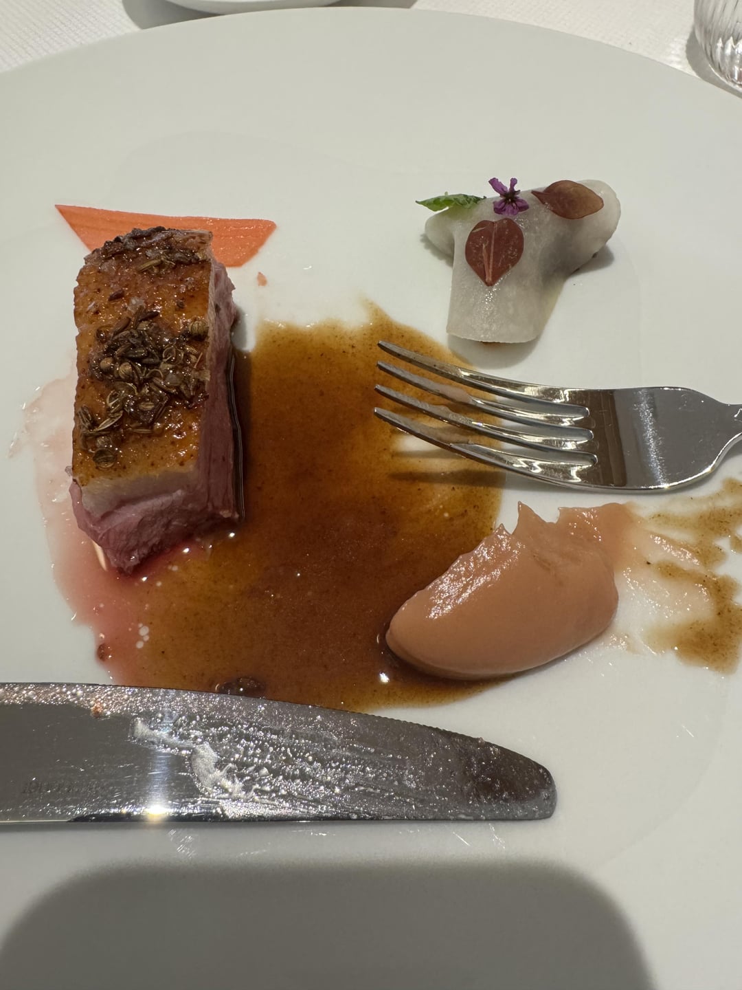 Course 8 the duck was perfectly fatty and tender and the bacon sauce really made it. The rhubarb in the top right was the stand out.