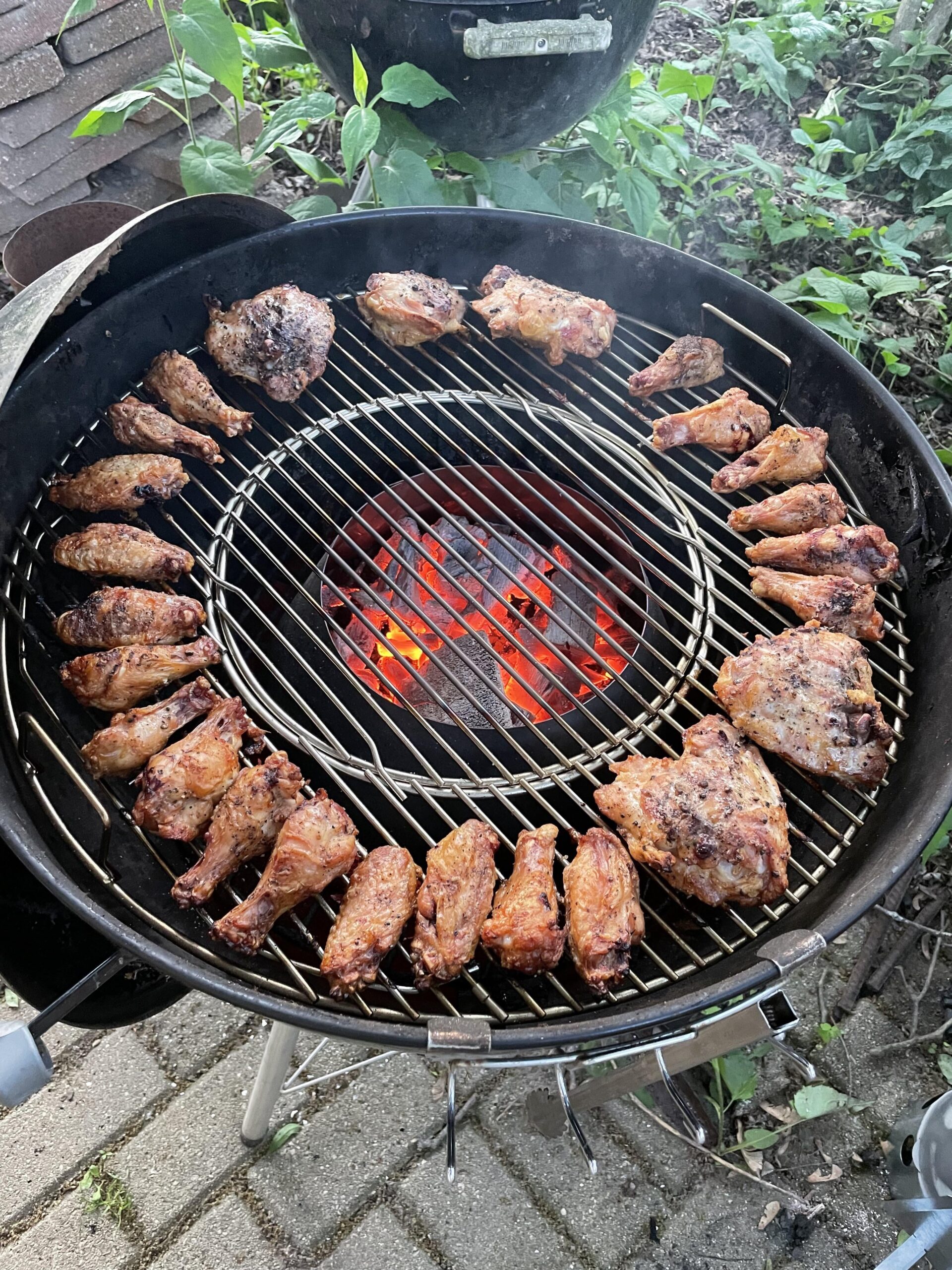 Found a Vortex on clearance and put it to use in my Weber kettle the other night. Wow! I'm not sure I'll be able to grill wings (or thighs or legs, etc.) any other way again. Mine went for 50 mins and that seem a little too long. BUT, they were delicious!!