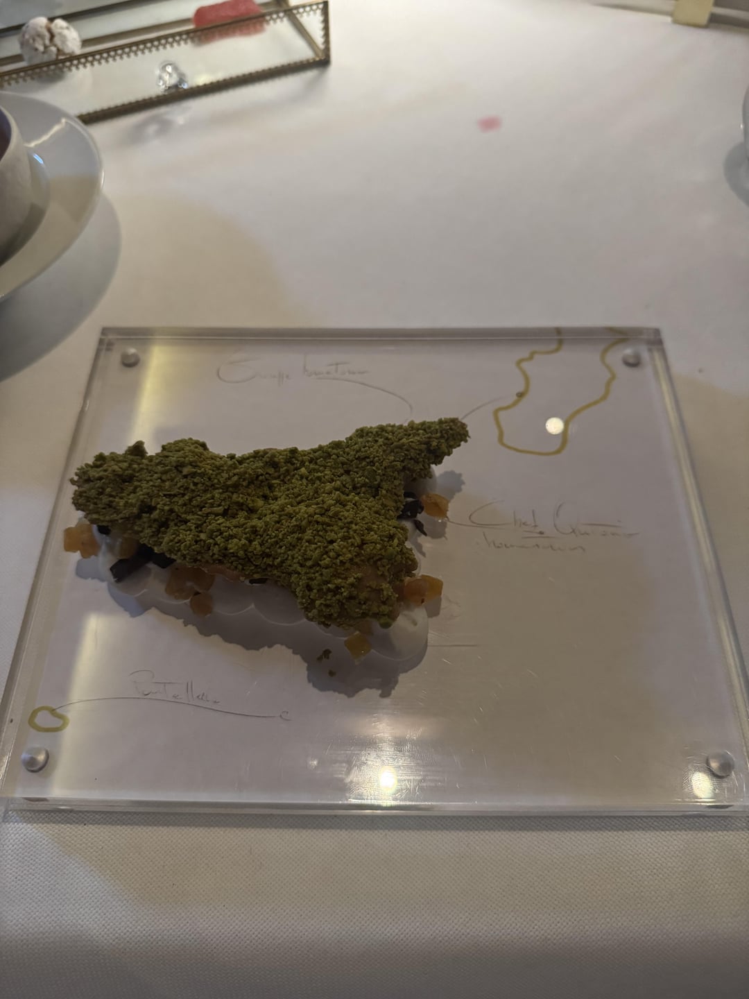 • The Sicily shaped pistachio crisp w/ piped ricotta w/ mixed in dried apricot and chocolate.