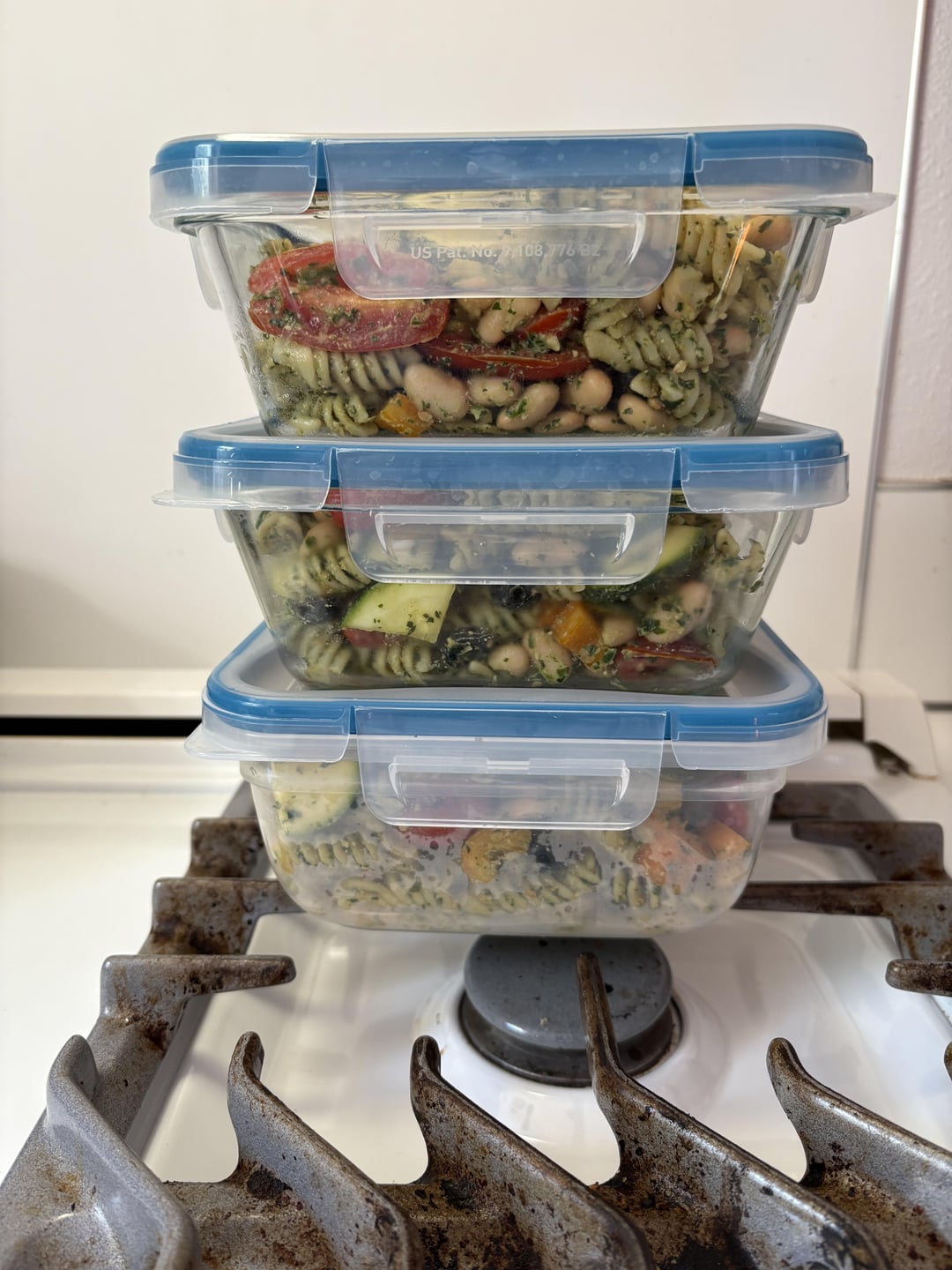I’ll just portion some of this pasta salad out onto a bed of spinach each day for lunch.