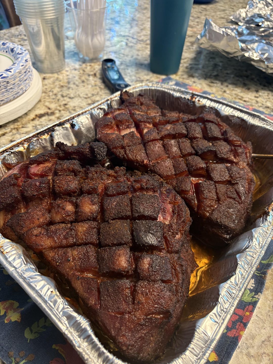 Put them in at 4am at 180 high smoke for 3.5 hours just for smoke flavor. Then turned the heat up to 250 for a few more hours and spritzing with apple juice until stall, which was early around 153 IT. I did a faux “foil boat” with those cheap metal baking pans, adding a little apple juice to the pans and spritzed every 45 mins. It was slow climbing through the stall (and I needed these to be done and resting by 3pm for 5pm dinner), so I put foil on at 175, draining the liquids every 30 mins so it wouldn’t get pot roasty. At 198 IT they were all probe tender and I removed foil, drained liquid again, AND REDUCED TEMP to 165 high smoke so they could get one least go of smoke exposure for ~40 mins.