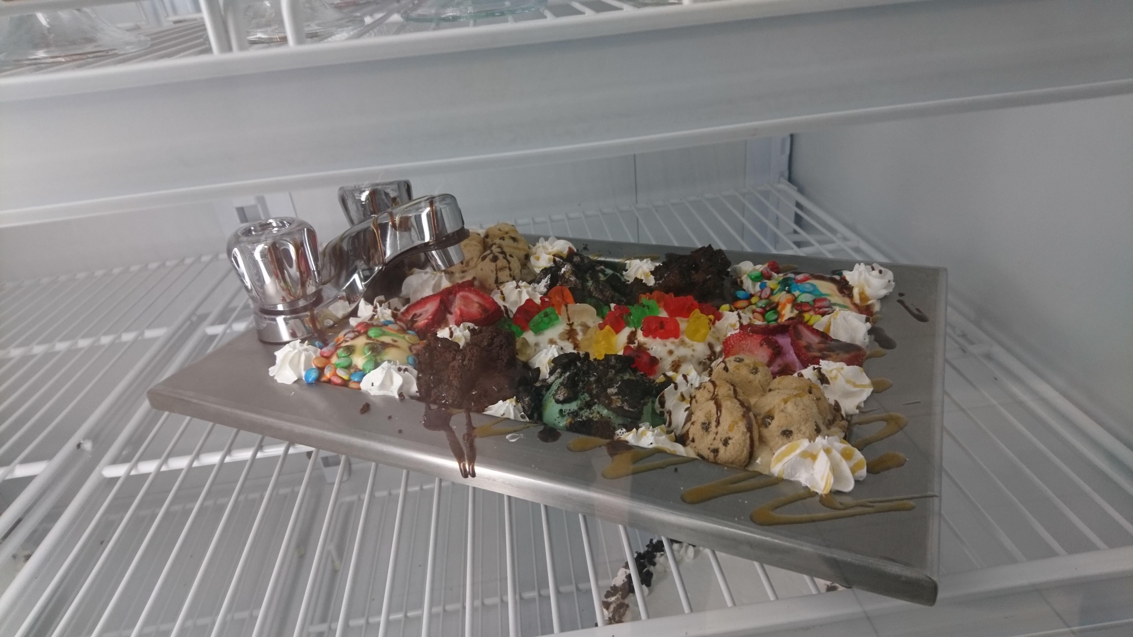 I understand that this is a huge ice cream dish and they have to pre-make it and put it in the freezer until ordered, but why wouldn’t they add the M&Ms fresh right before serving? Now they’re all melted and the color is bled out of them. This looks bad…