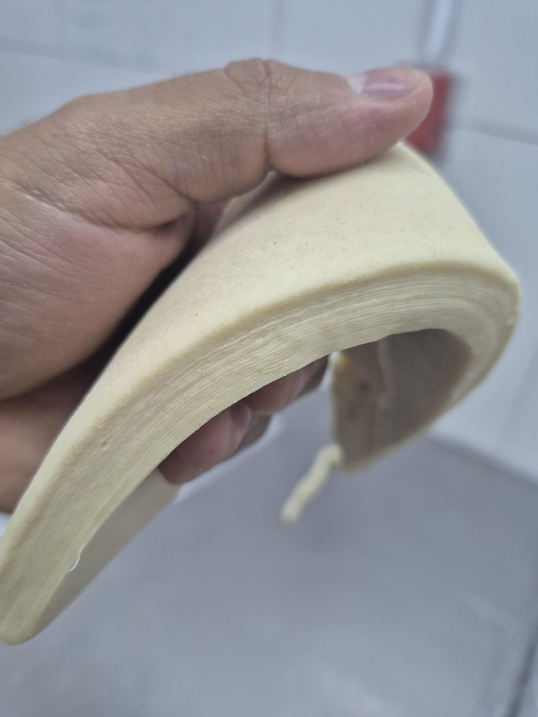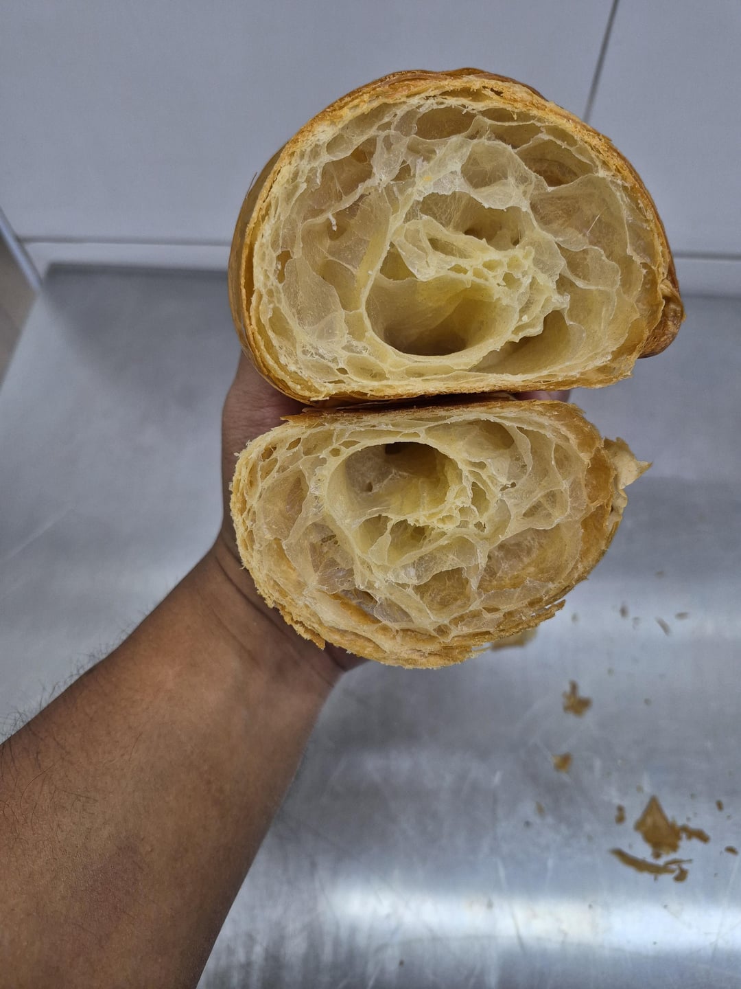 Now then, regarding process I usually go for a 2½ days; I tend to prepare the dough on day 1 and let it bulk proof for 3 hours give or take (I use about 0.8% yeast) and then I degass the dough to form a rectangle and keep on the chilled for the night. On day 2 I defrost the croissant dough on the fridge (takes about 5 to 6 hours to reach 15°C) and then chill it for 20 to 30 minutes to reach 2-5°C. I plastify and form a rectangle out of the butter the same day I'll laminate the dough so I can control it's temperature better (I tend to use it between 12 to 17°C) and to make it easier to use as well. Regarding the lamination, I make a double and simple fold with 30' rest + 10-15' on the chiller between each fold, and roll the dough until about 5mm before cutting and shaping. Each piece is about 10x25cm (give or take, the dough sheeter works funny sometimes, but never rips off the dough or breaks it at all) and they weight from 85 to 95gr per unit. While shaping the triangles, I used to stretch them a lot to the point they'd go from 25 to 33 or 35cm in some cases (the dough would allow me to do so, I was not applying too much force to stretch them), then roll them not super tight but enough for them to keep it's shape. After that, I'd let them proof for about 8 hours if fresh, 10 if frozen (2 hours to let them defrost). They used to come out fine, with a nice honey comb crumb, but the weather has been getting colder and humidity has been decreasing as well, and now it looks like the picture in the middle. It's worth noting that it used to be worse, but increasing proofing time helped a lot. I preheat the oven at 190°C and bake them at 160°C for 18 minutes give or take, which is the time and temperature I've been using so far (the oven is a 10-tray convection oven ZMMAG with very powerful fans that can't be programmed, so I've been using that baking profile. We follow a rule of "if it's meant to be baked at 180, do 20 less").