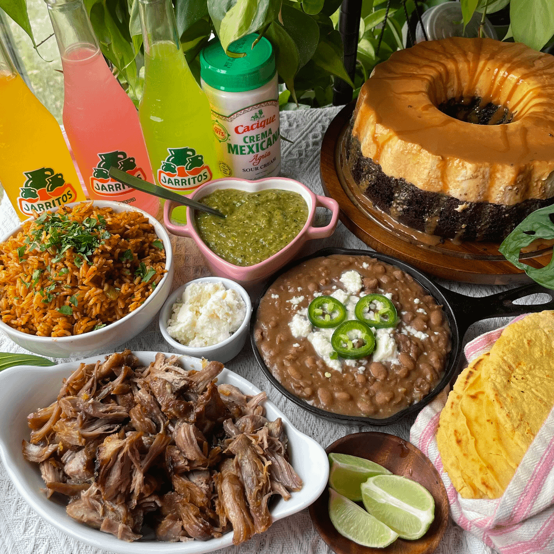 Boyfriend wanted tacos for dinner. Carnitas, red rice, pinto beans, salsa verde, homemade corn tortillas. Plus a chocoflan for dessert.