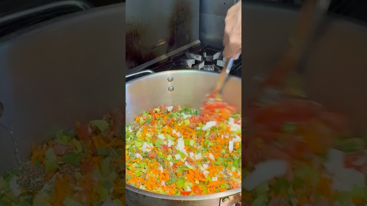 guys imagine having to cook rice for 30 people it’s actually not too hard let me show you what we’re going to do i start with some butter in a pan and I throw some more butter in the pan cuz I like it to be nice and buttery i got onions celery carrot green onions tomatoes big pinch of salt and I’m going to add some black pepper as I go in with fresh herbs I have rosemary and thyme we throw that on the stove and we’re going to start moving it around give it a nice little sauté and when it starts to soften up we’re going to go ahead and add in our rice now we put all that butter so that we can get this nice and mixed around coat that rice really well and I’m using chicken stock today i do two to one so two parts stock to one part rice we’re going to mix that around let it come to a simmer guys at this point we’re going to cover it just like whether you’re doing two cups of rice or 20 we cover that thing let it go for about 20 minutes and pull off the lid give it a little fluff and that looks ready i’m going to throw it down on a tray and guys just like that it’s rice peel off for 30 people in 30 minutes it’s not too hard but a treat thanks for watching cheers everyone