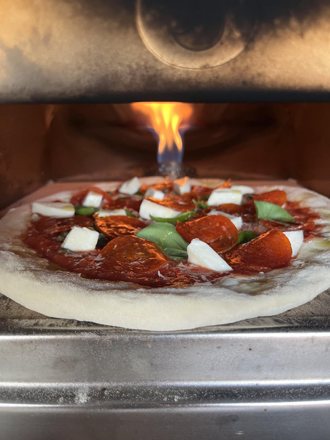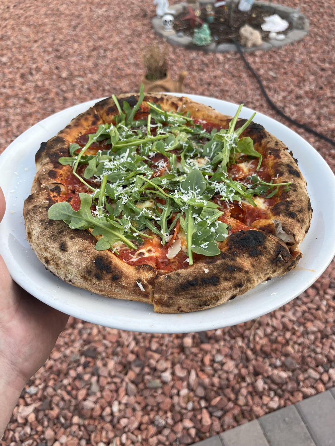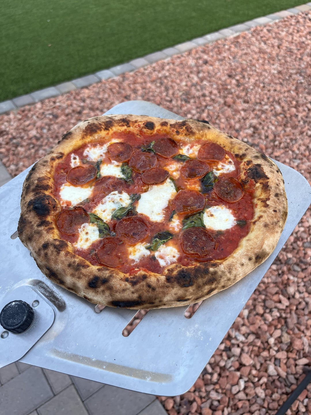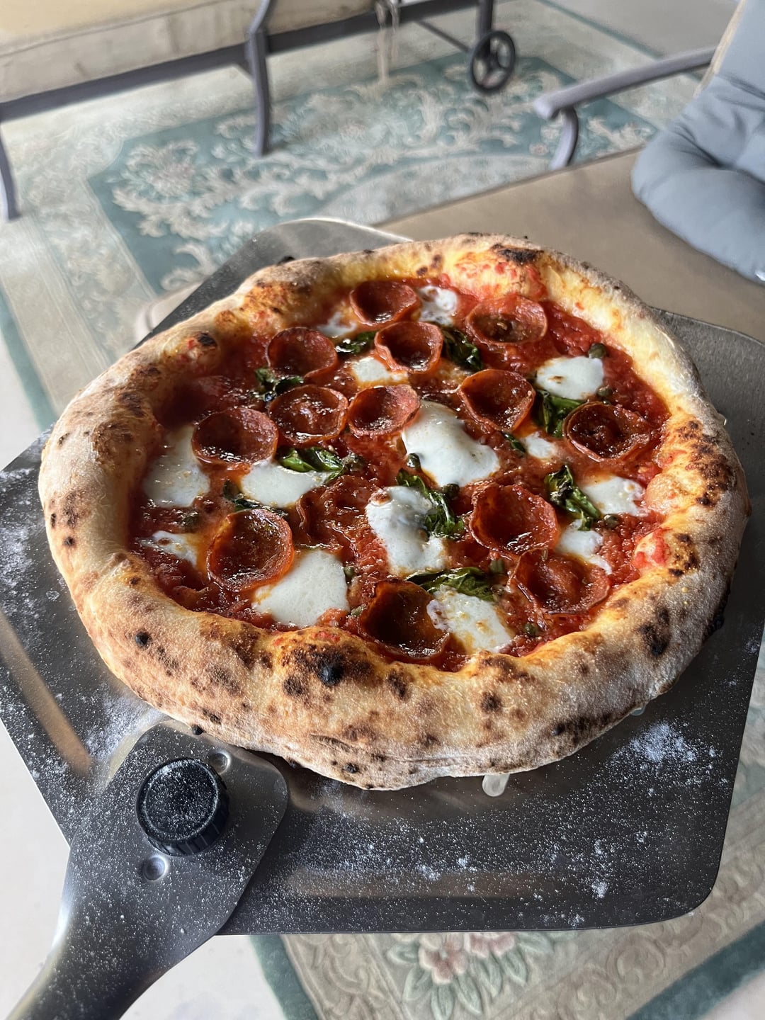 Cooked in my roccbox at 750 degrees. I added the recipe in one of the above pictures. I mixed all dry ingredients then added the water. Hand mixed in bowl for about 3 minutes. Let it relax for 10 minutes and mixed or really folded for another 10. Covered it and let it proof on the counter for 12 hours. Then i divided it into three 265g balls and then cold proofed another 24 in refrigerator. Pulled out 1 & 1/2 hours before bake. I love Neapolitan style but also love N.Y. style and was trying to find what i think is right in the middle. Light and airy on the inside with a great crispy crunch and perfect chew. Flavor of the dough was just perfect!!!!