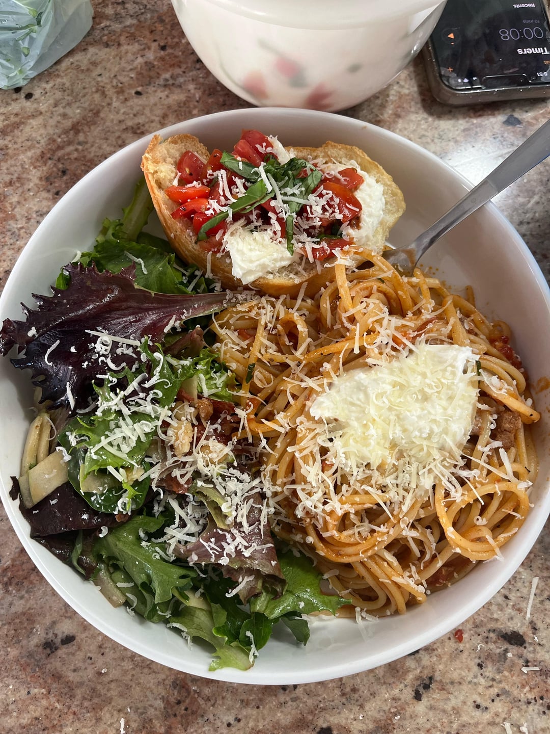 The gf whipped up some bolognese pasta with a side salad and some bruschetta. Love coming home to her home cooked meals after a long day 🔥 🤤 ❤️