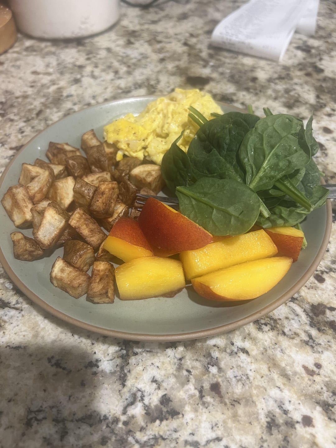 Nectarine, spinach, eggs & roasted potatoes