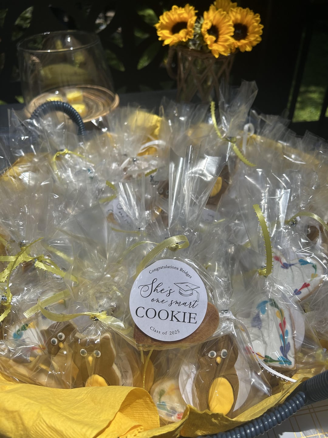 My sister and I made these for a high school grad in the family who is going to Bryn Mawr College. The mascot is an owl. We packaged them as favors for guests at her graduation party.