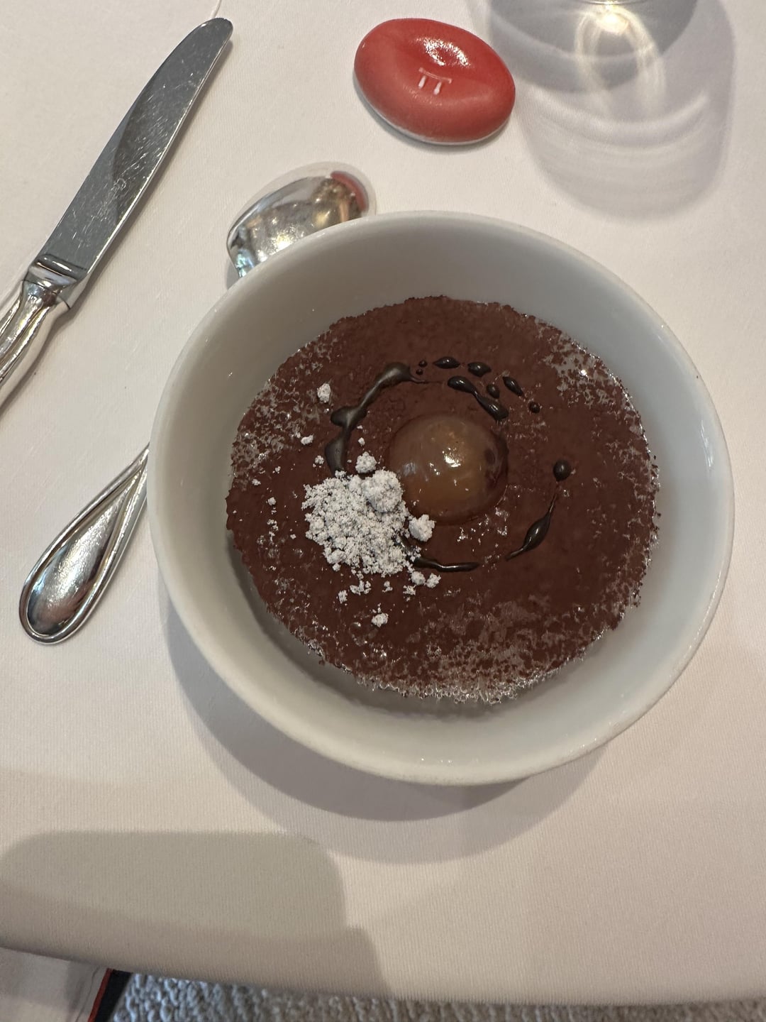 The service was pretty much flawless. We never had to wait for more than 2 seconds for anything, and I mean literally anything. It was almost magical how, despite how you couldn’t really see many staff members in the dining room itself, whenever something needed to happen someone magically appeared to do it at precisely the right time. This was most evident on two occasions: (1) since there were two of us, there needed to be 2 people lifting the cloches at certain moments throughout the meal, and someone always appeared to help our waiter out at that moment; and (2) when my girlfriend went back to her seat from the bathroom, there was a staff member what we have not seen at all up to that point who popped out of nowhere to tuck her chair in with literally zero time wasted, and he was also never seen again. All of this was done with such grace and elegance as though the staff were floating across the dining hall throughout the entire service, and we were so impressed – it was a lot better than the service we had at Alain Ducasse in London. The demeanour of the staff themselves were very professional but not especially warm, though this style of service is perhaps somewhat expected at a French restaurant. We got a special treat from the kitchen by way of a celebration cake which was a very nice touch.