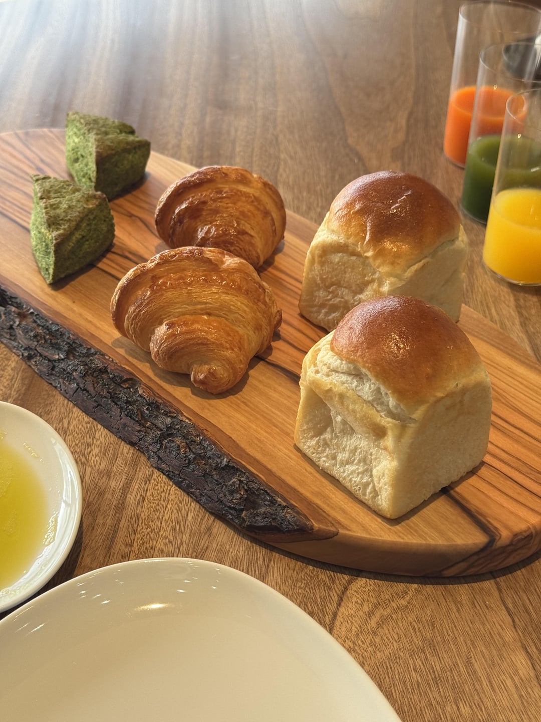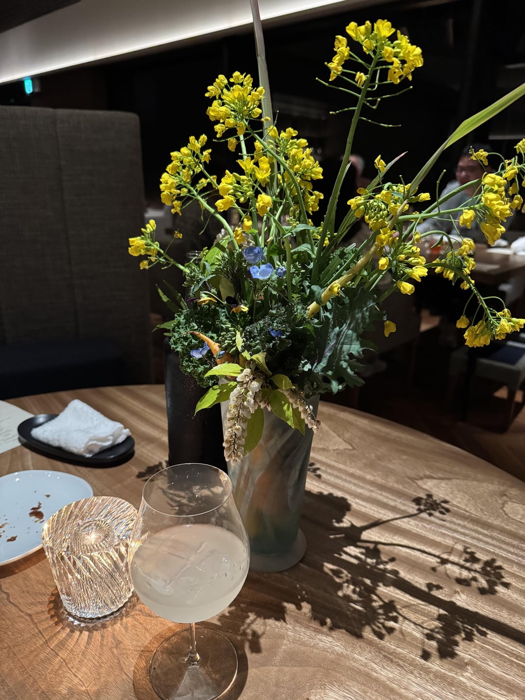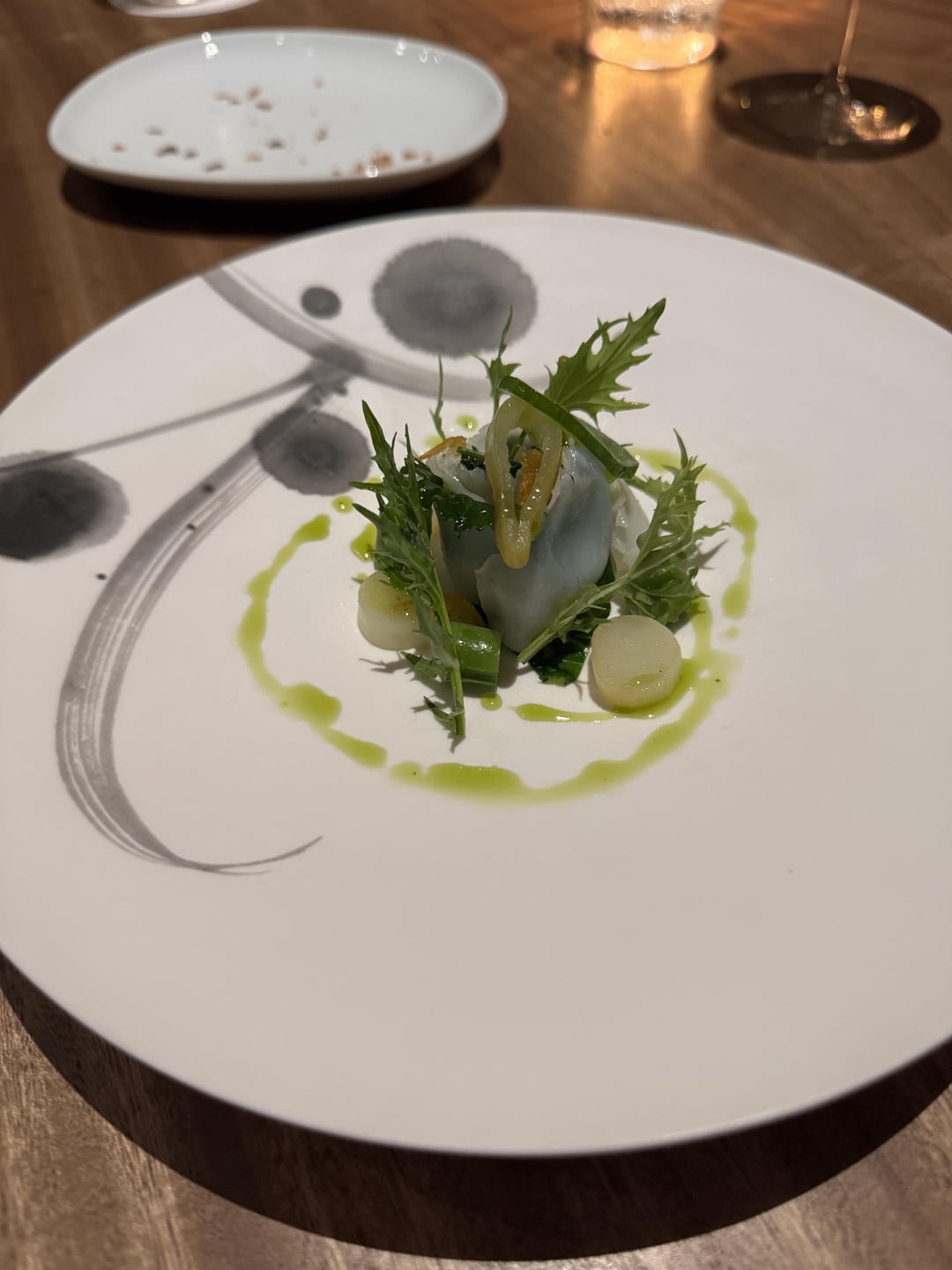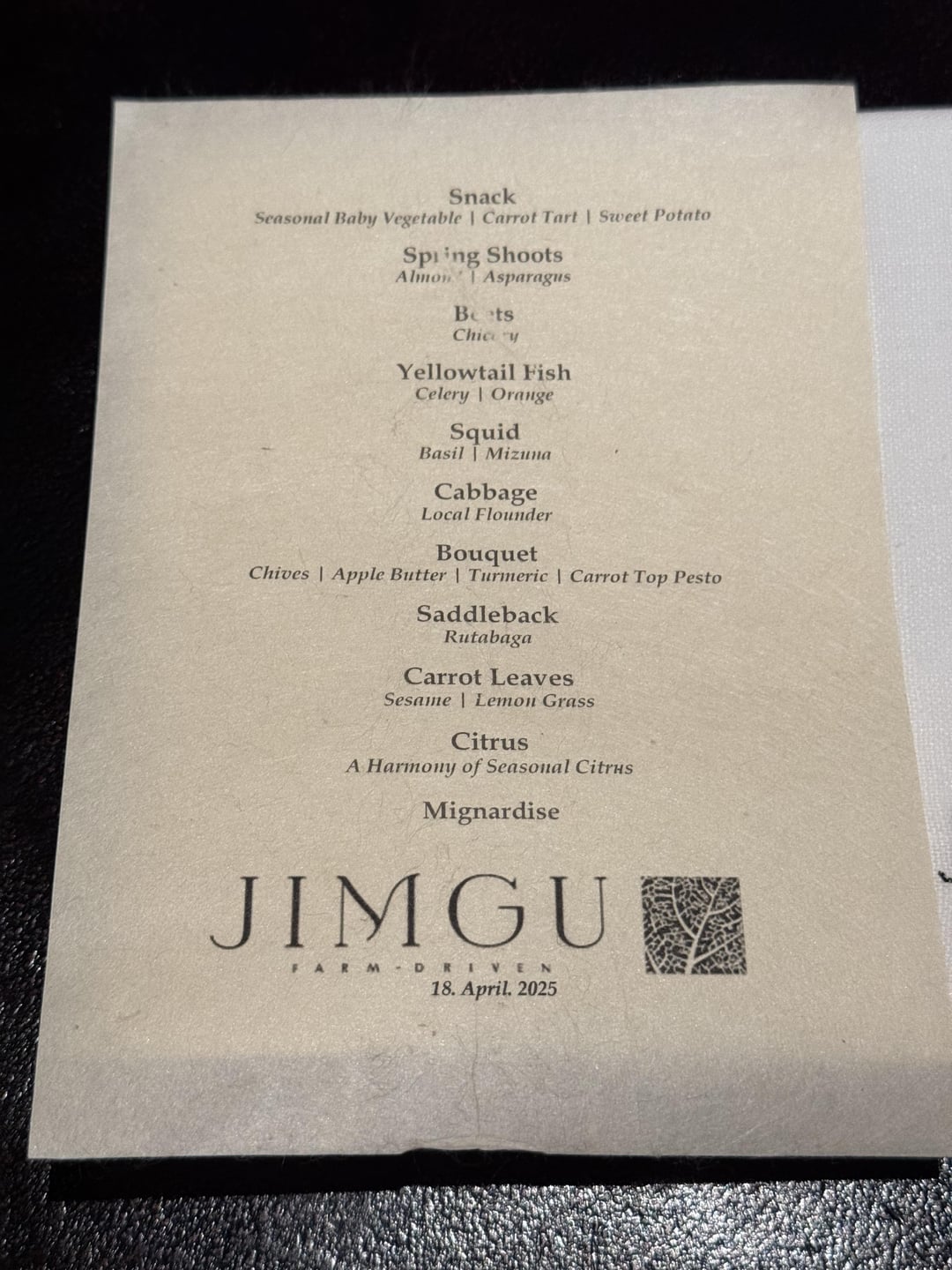 Dinner began in JIMGU’s greenhouse, where we were welcomed with a short tour of the herbs and vegetables that would feature in the meal. It was a relaxed and intimate setting, and we were offered vegetable snacks and an apéritif among the greenery. This was a lovely and immersive start to the meal. From there, we were led to the main dining room, a modern yet warm space that mirrors the restaurant’s commitment to seasonality and simplicity. My dinner consisted of nine courses (menu included in photos), with freshly baked bread on the side and mignardises with coffee/tea to end.