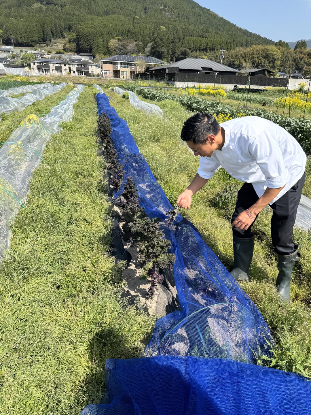 The farm is just a 5-minute drive from the resort and is within walking distance of JR Yufuin Station. We walked through the fields as Tashi picked fresh herbs and vegetables for us to taste, sharing stories of his move from New York to Japan, the challenges of organic farming (dealing with pests without pesticides), and his long-term vision, which includes growing their organic chicken farm and expanding his crop variety (he hopes to grow more nut plants in the coming seasons).