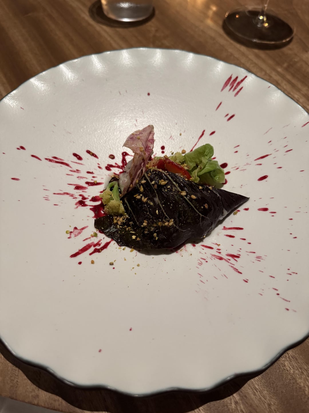 - The Signature Bouquet dish (First pictured) – This is first presented tableside as a bouquet of flowers before being taken to the kitchen and transformed into a plate that looked like post-modern art. It reminded me of L’Effervescence’s iconic salad. I scraped the plate clean.