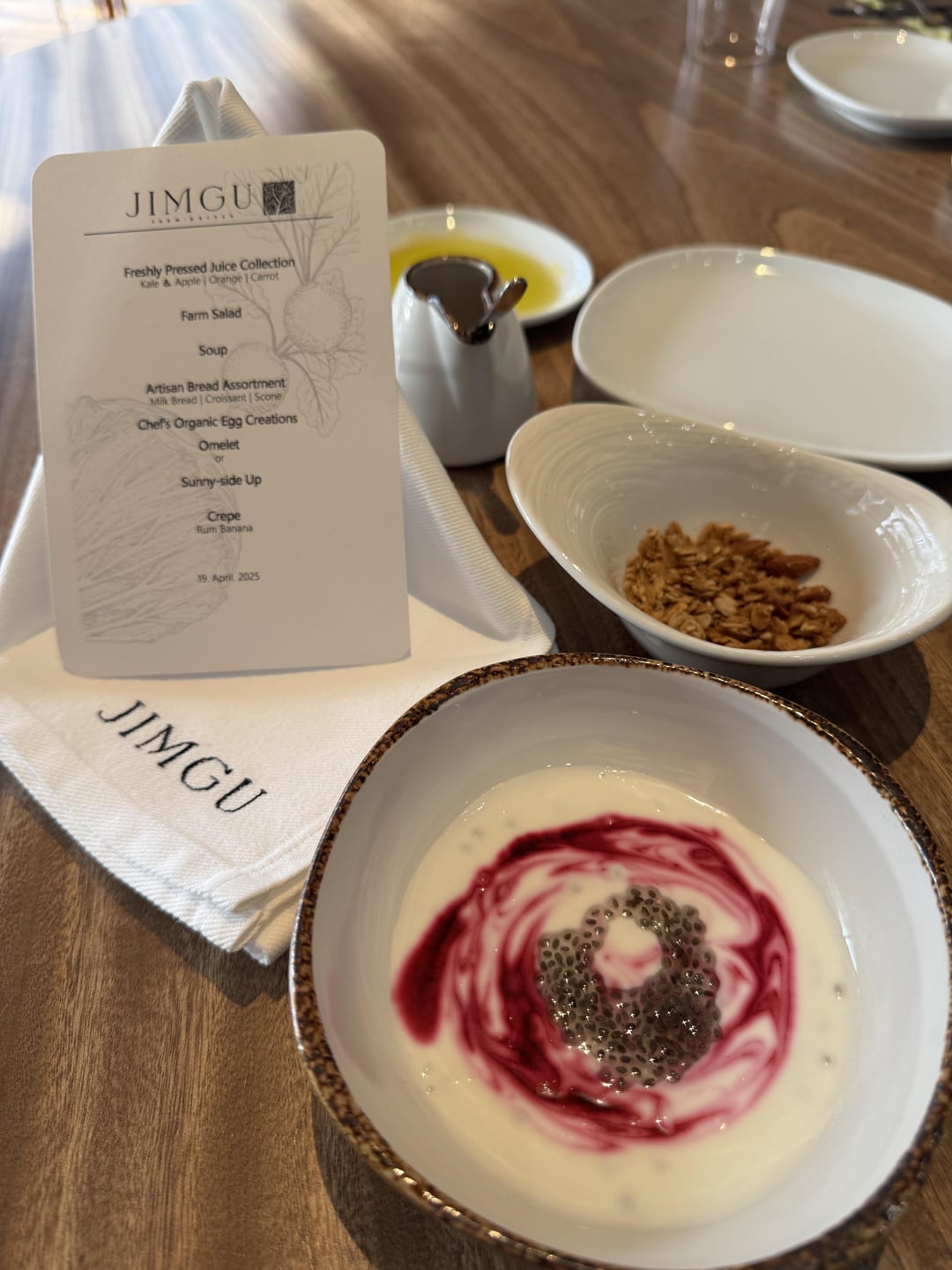 Staying guest at ENOWA would be served both dinner and breakfast. The next morning, we had a delicious seasonal breakfast at JIMGU (photos and menu also shared). For breakfast, the highlight was the turnip soup, the omelet (featuring organic eggs from their nearby chicken farm) and the banana crepe. Before check-out, we were pleasantly surprised to be offered a personal tour of the JIMGU farm led by Tashi himself.