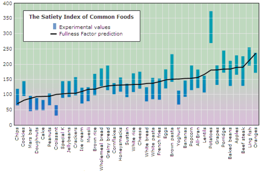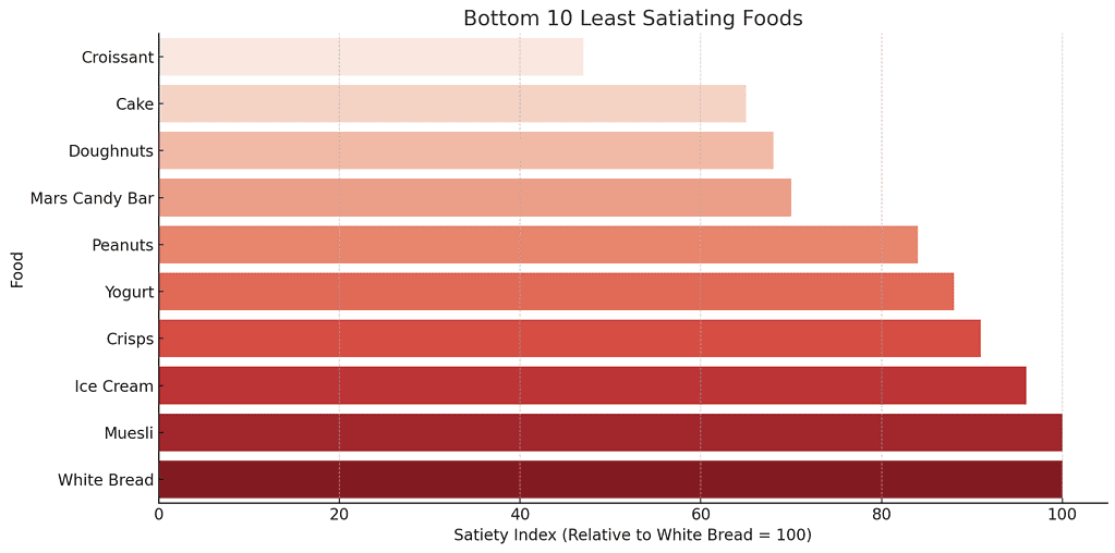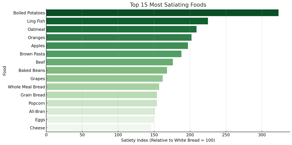 Each food’s Satiety Index was calculated by comparing the area under the curve (AUC) of satiety responses to that of white bread, which was set at 100. Foods scoring above 100 were more filling than white bread; those below were less. This simple, clever method revealed which foods kept people fuller for longer — regardless of calorie count.