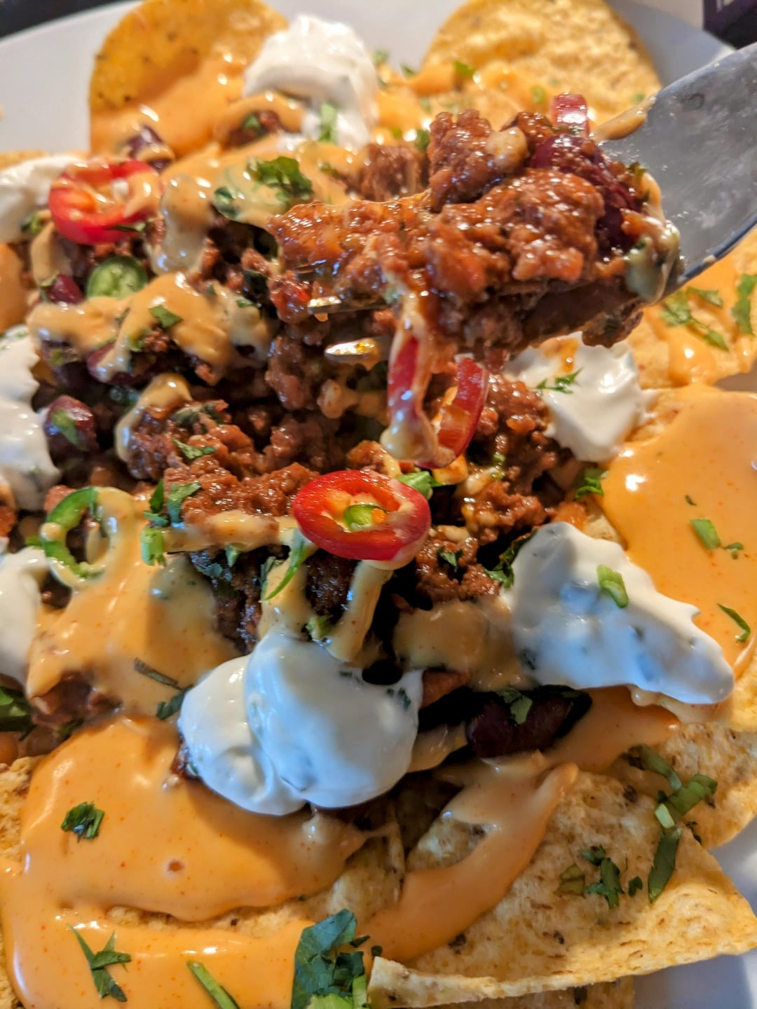 It’s beef chilli cooked in beer with my attempt at nacho cheese, sour cream and store bought crappy tortilla chips