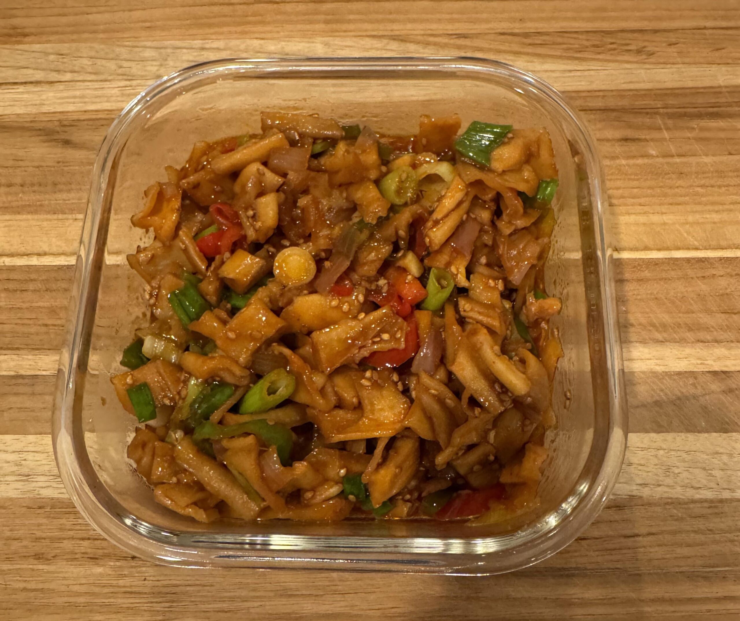 I discovered in my pantry that I bought dried gourd 박고지 at H Mart a while ago. I couldn’t find a decent recipe anywhere on how to prepare it, so I winged it. I soaked it and changed boiling water a few times, and then cut it up. I stir-fried it with some onion, red and green pepper, garlic (of course, ginger) – and then added some gochujang, soy sauce, maesil, and finished it with green onions, sesame oil, and sesame seeds. Still not sure if it is a real recipe – but definitely feels authentic.