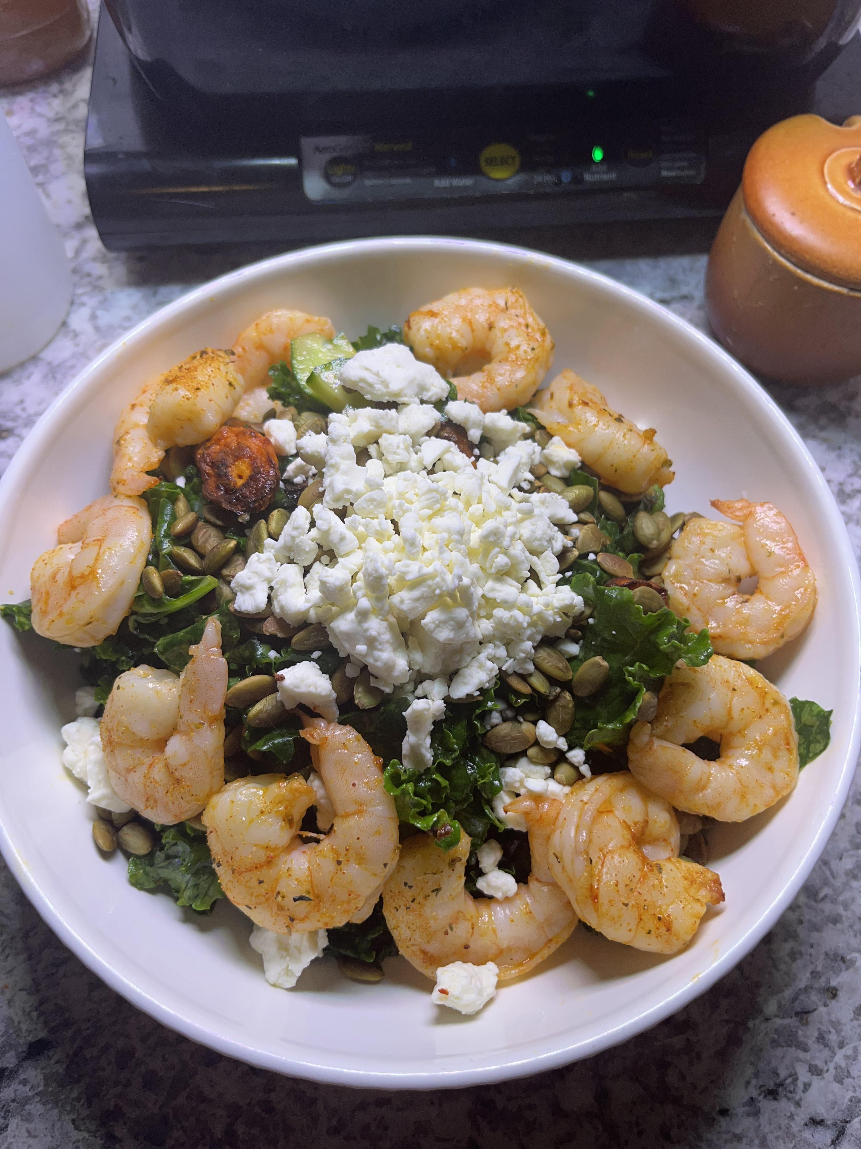 I got the [recipe](https://www.reddit.com/r/mediterraneandiet/s/xoPdFKJxN5) from this subreddit and I added some air fried shrimp seasoned with cajun seasoning. Also added some thinly sliced cucumbers.