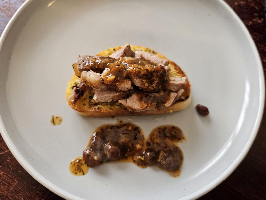 Starter: Lamb strips with a honey raisin sauce on garlic ciabatta