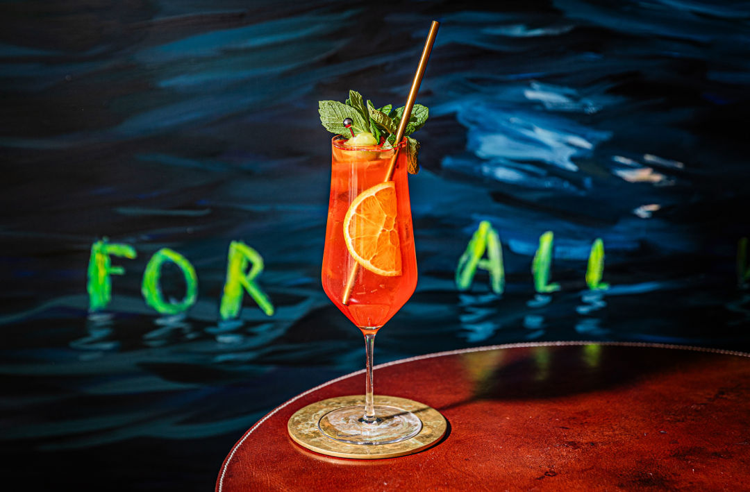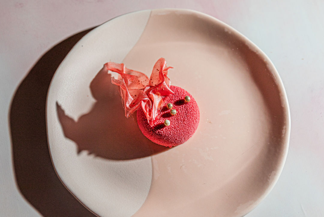 Goodnight Hospitality’s pastry chef, Micaela Victoria, helps diners end the night on a sweet note. The six-course menu’s pre-dessert is inspired by the flavors in an Aperol spritz, made with Aperol jelly, bitter orange sorbet, grapefruit meringue, and rhubarb confit. The main dessert, influenced by the colors of the Carnival of Venice, features a strawberry pink pepper crémeux, goat cheese mousse, almond dacquoise, and strawberry tuile on top.