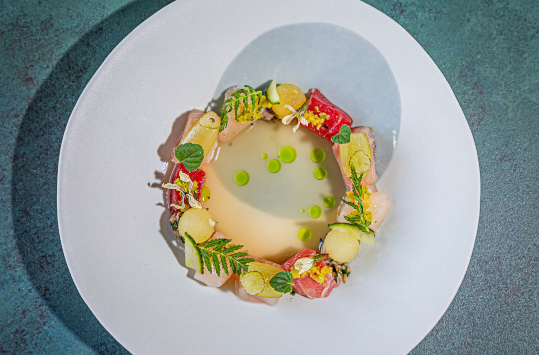 The tasting menu’s dishes differ depending on the number of courses a guest signs up for. The nine-course menu features a risi e bisi, a classic Italian dish of risotto with peas. But Riccio promises you won’t just be getting rice and peas—the kitchen melds aromatic carnaroli rice with a pea tendril and green plum puree, topped with shrimp, lardo strips, and pancetta furikake. Another dish, the Laguna de Venecia, combines hamachi, tuna, clams, and scallops with celery, apple, and a drizzle of prosecco grape vinaigrette.