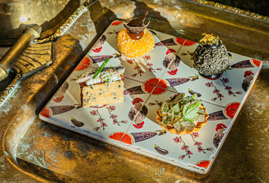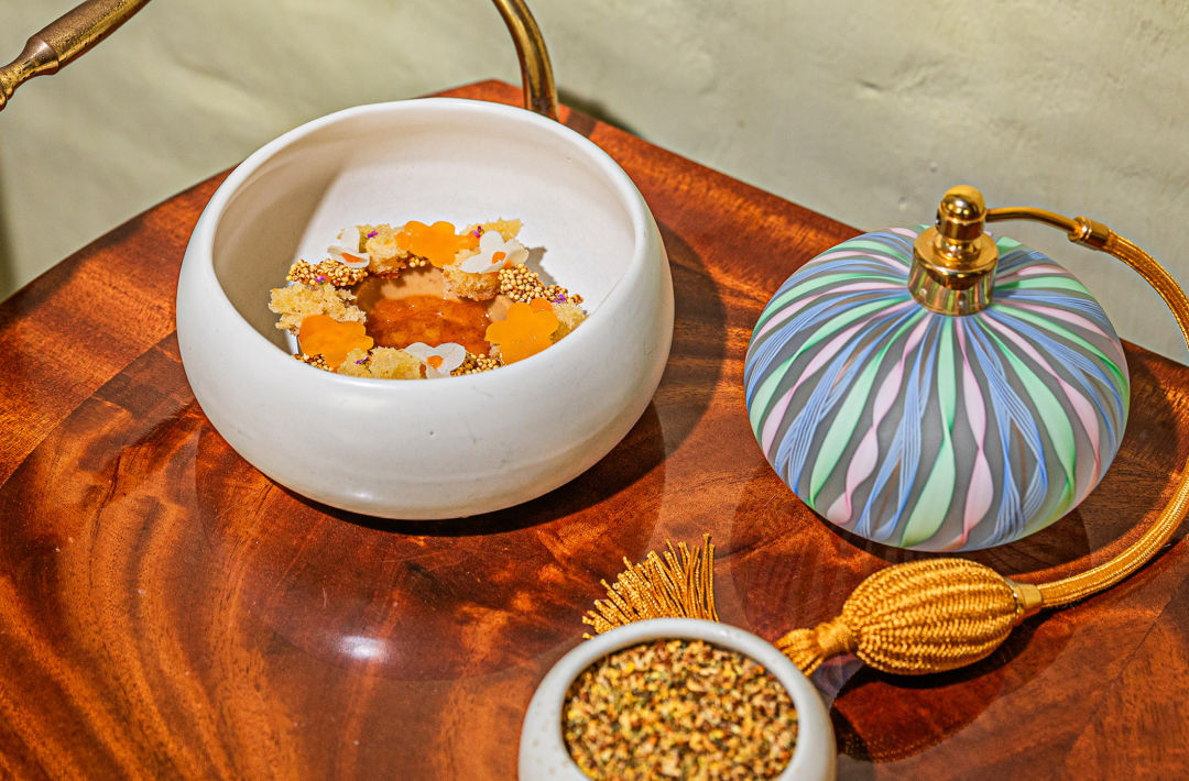 The pre-dessert in the nine-course menu is a play on Murano glass, crafted using a candy apple sphere stuffed with apple tarragon jelly, black olive caramel, and tonka coconut yogurt. And for the main dessert, diners can dig into the profumo di osmanto, which explores the scents from the trade routes in Venice using an osmanthus flower crémeux, an apricot compote, a honey madeleine, and candied amaranth clusters, as well as an edible spray.