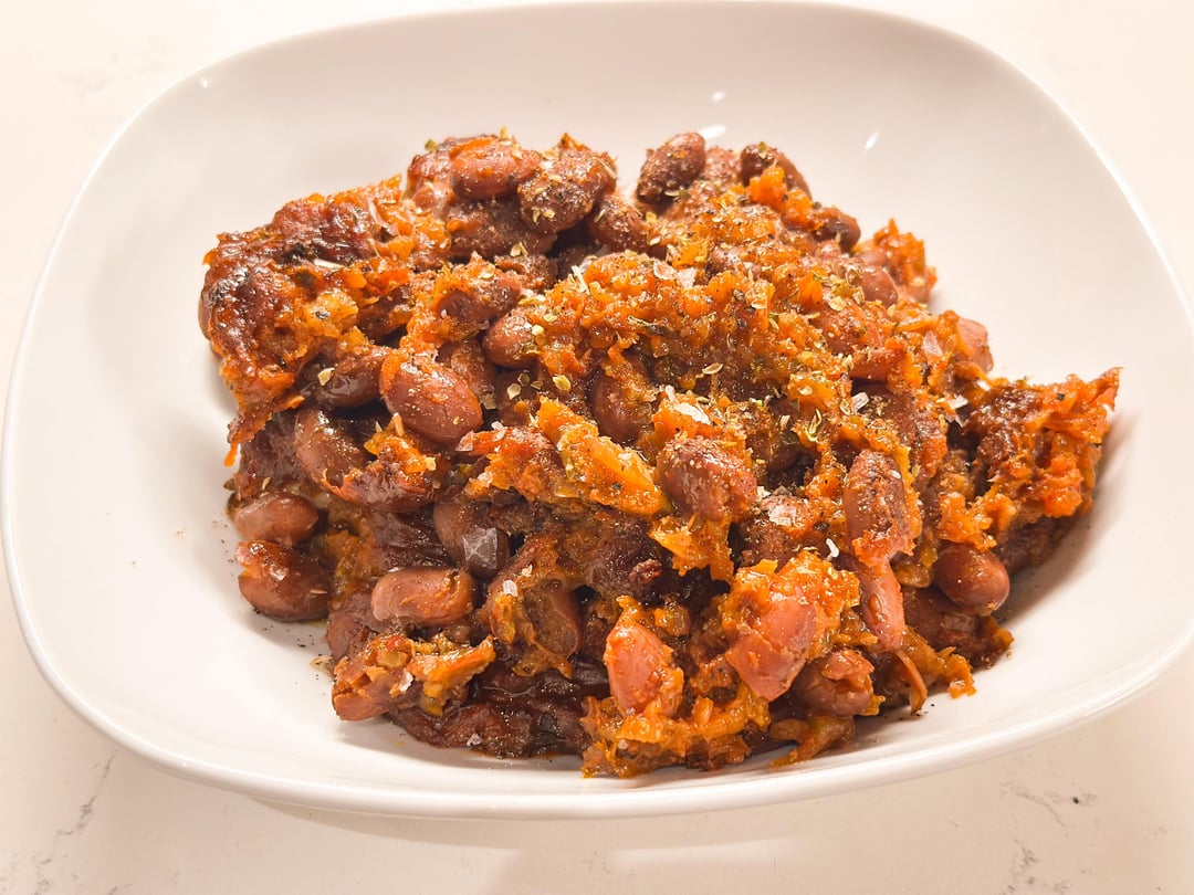 Gigantic beans, literally translated, gigantes plank is a simple and satisfying meal that fits perfectly into the Mediterranean Diet. Beans are soaked over night, and cooked in water, pepper flakes, and bay in a low oven. Grated onion, celery, carrot, and zucchini are sautéed before crushed garlic and tomato paste is sautéed into them, and finally grated tomatoes. The beans, their cooking liquid, and the tomato stew go into a casserole for a final trip into the oven.